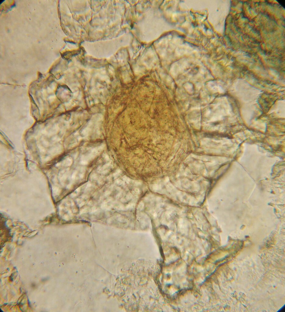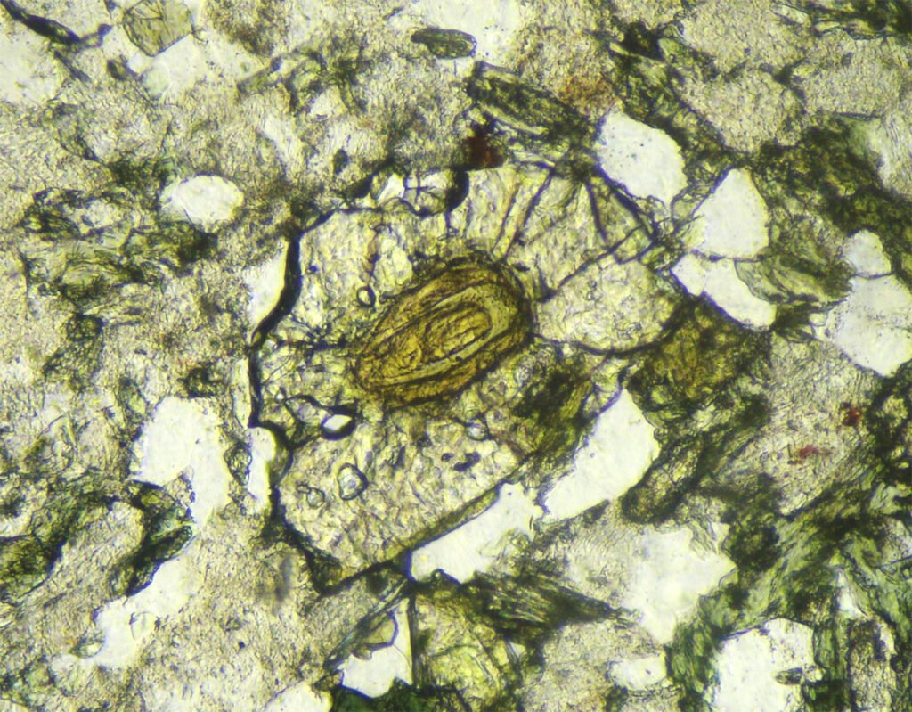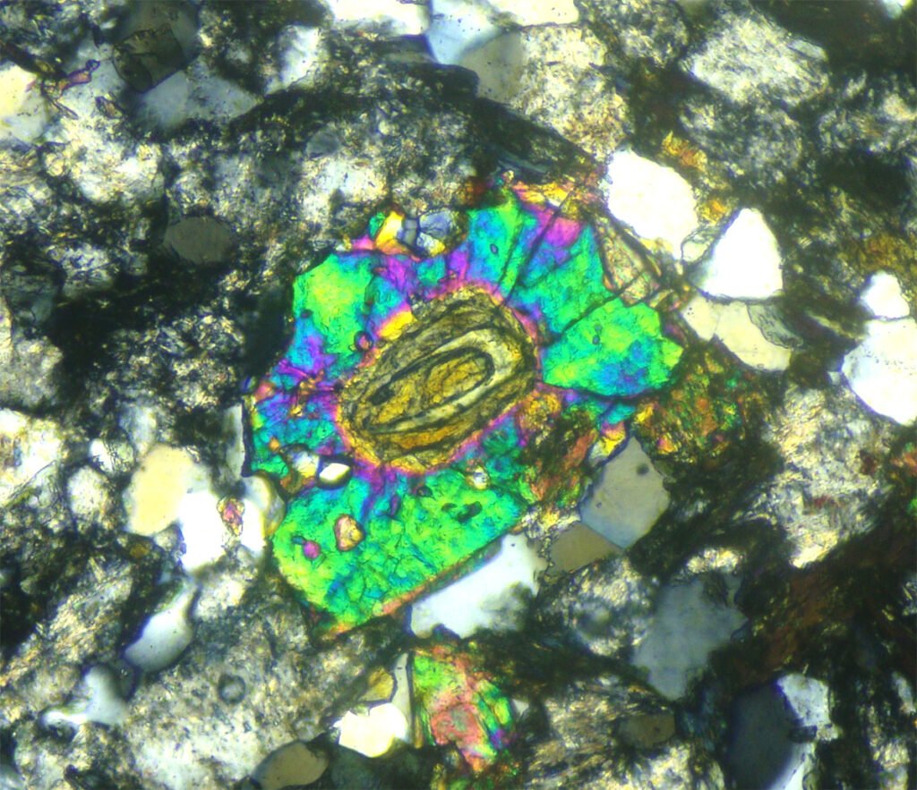 Altered allanite (metamict) can form a reaction rim of epidote and/or clinozoisite around it; this rim can be partial or complete.