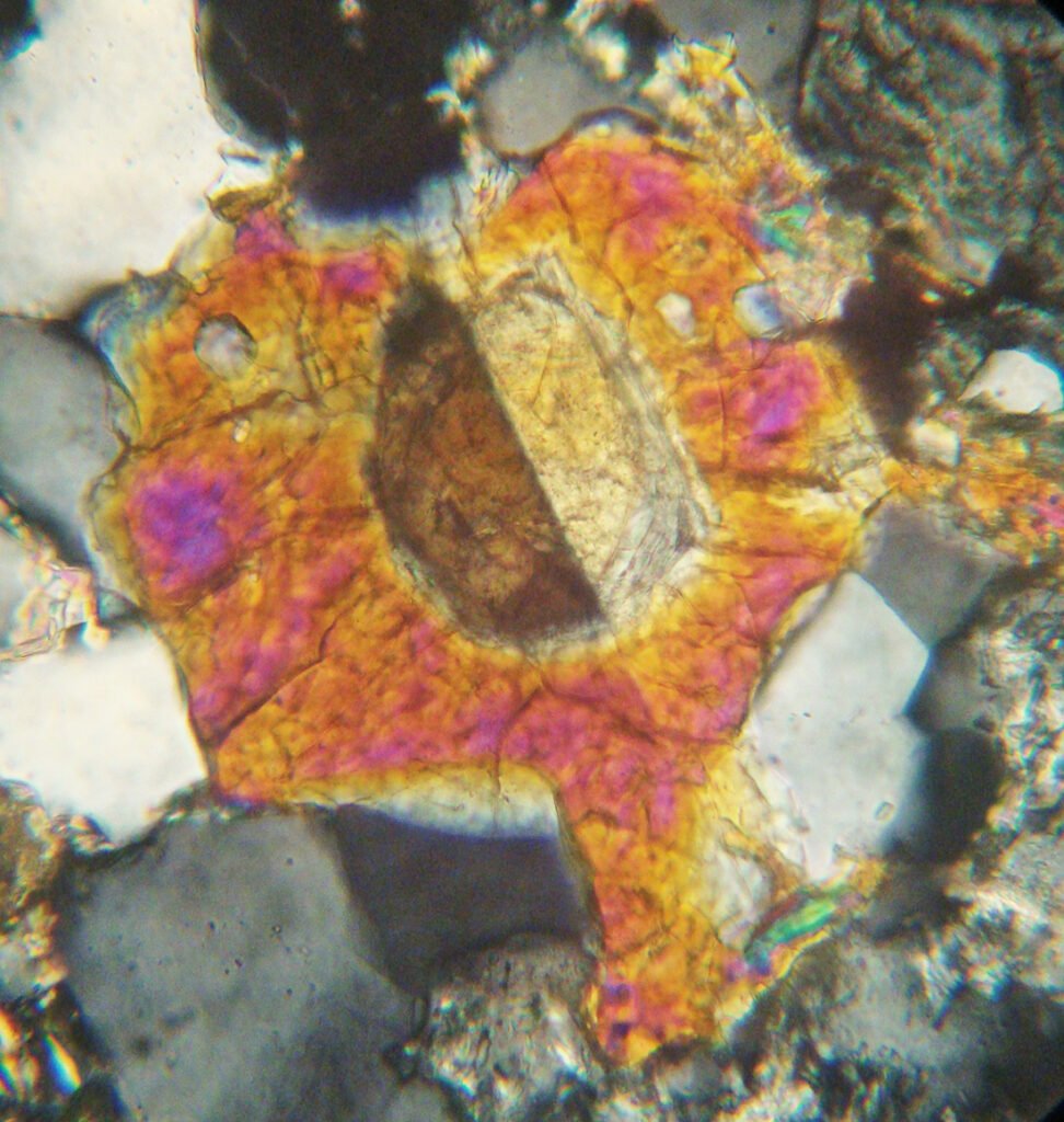 The mineral’s strong colors can make it difficult to determine the extinction type.