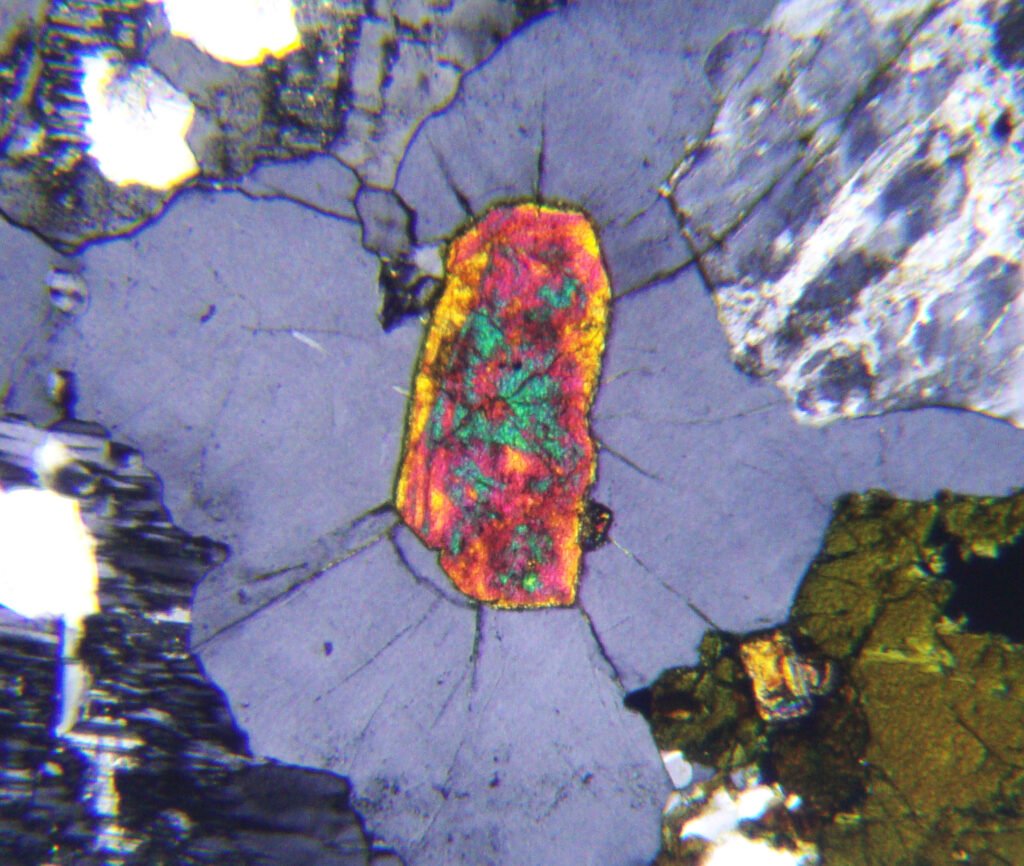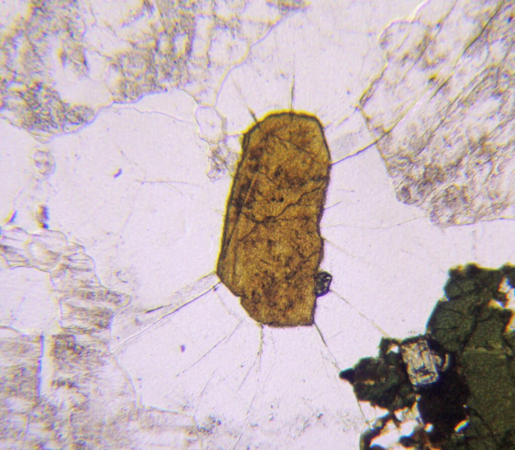 As it contains Th and U, the crystal is destroyed and absorbs water, causing the grain to swell, creating radial fractures into neighboring minerals.