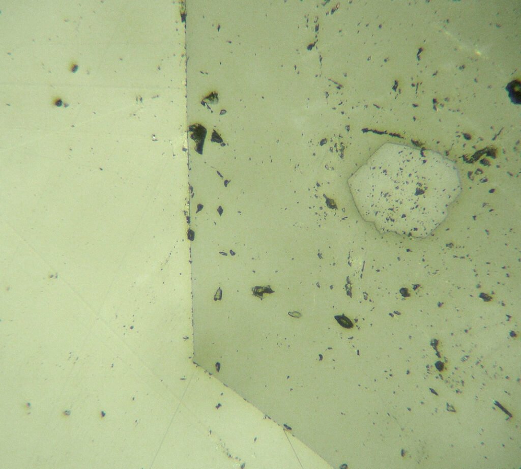 May be confused with: very low birefringence and rounded contours are typical.