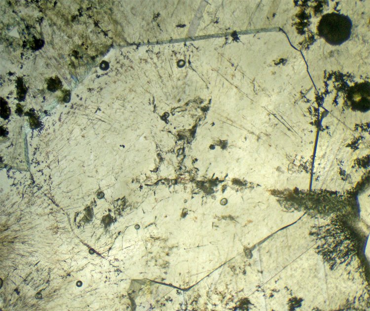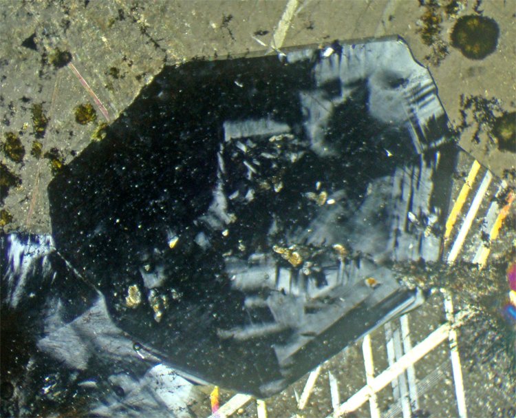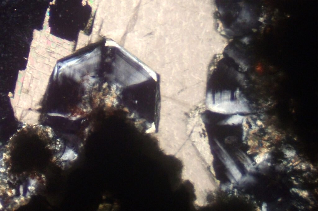 In large grains, it has anomalous birefringence with colors up to 1st order: black to very light gray to white. The crystals are sectored, with portions with different colors (black/gray/white), somewhat reminiscent of leucite, but the pattern of these sectors is different.