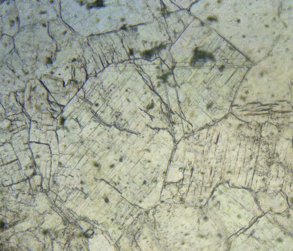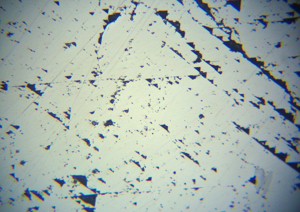 Polishing pits, triangular, aligned or not, occur when the polishing is not perfect and the crystals are relatively large.