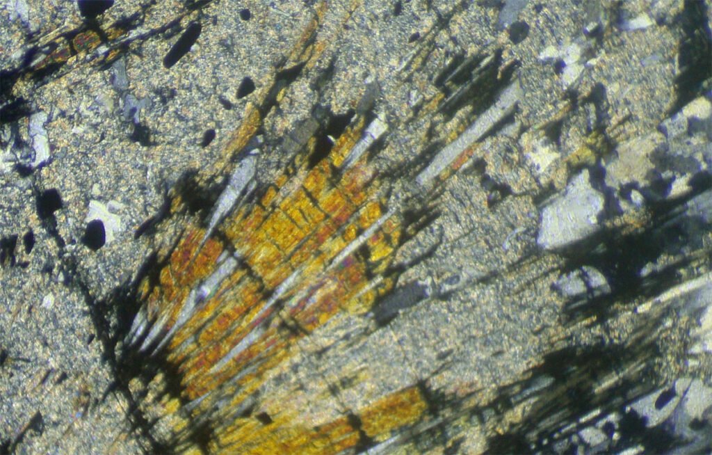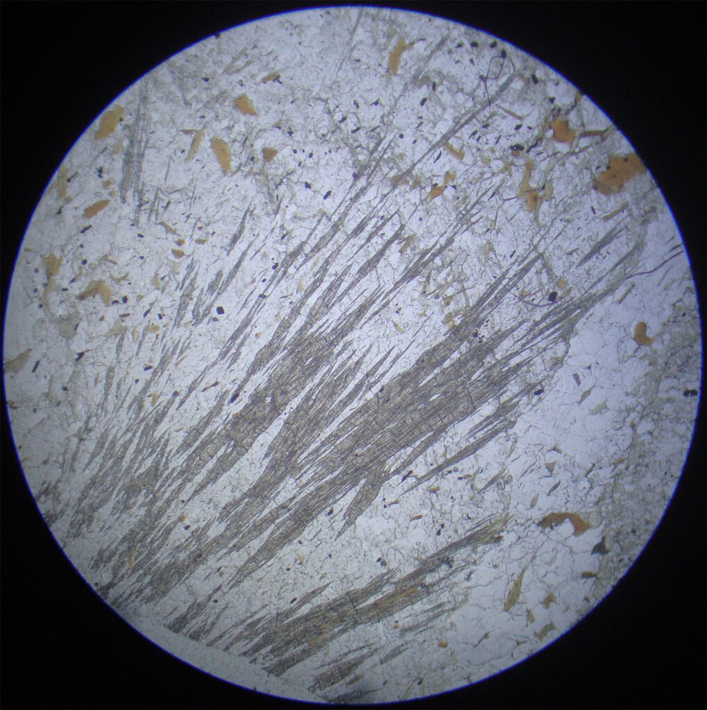 Grain shape: a well-developed fibrous habit is easy to observe and quite diagnostic, with radiated aggregates of acicular crystals forming bundles among the other minerals in the rock.