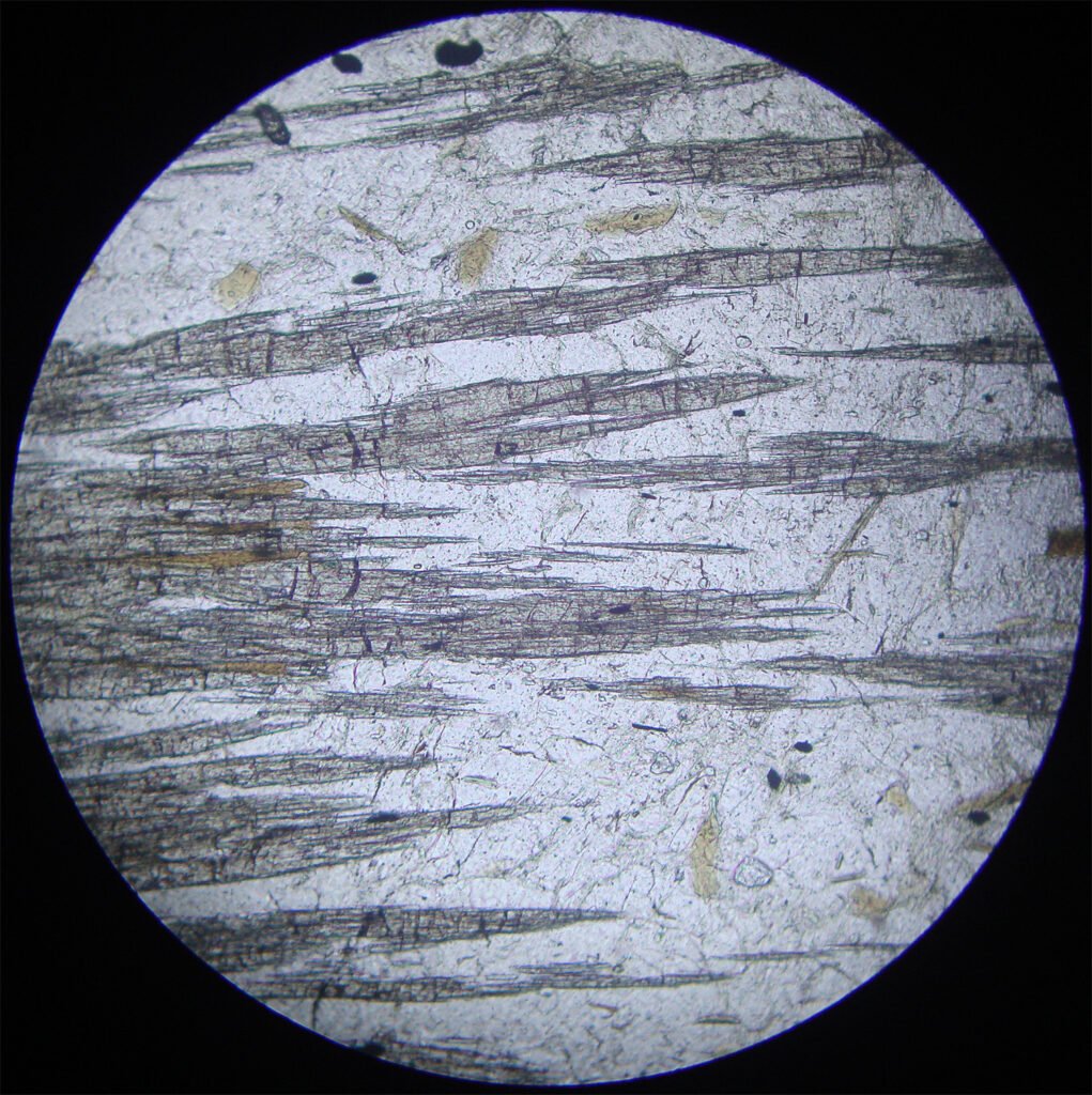 Sample preparation: the polishing of anthophyllite is like the polishing of other silicates, despite the excellent cleavage and fibrous habit. The chipping problems of kyanite and wollastonite do not occur and a final good polishing quality is achieved without problems.
