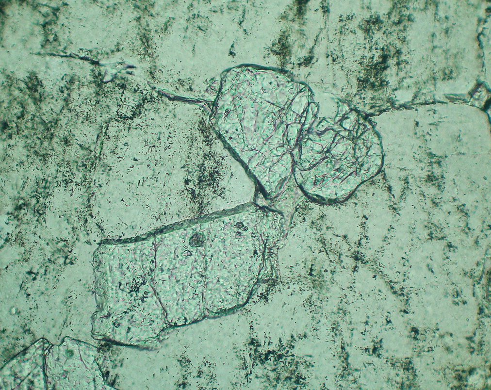 Cleavage: {0001} poor, {10-10} poor. They are not normally visible on a thin section. Prisms may exhibit spaced fractures.