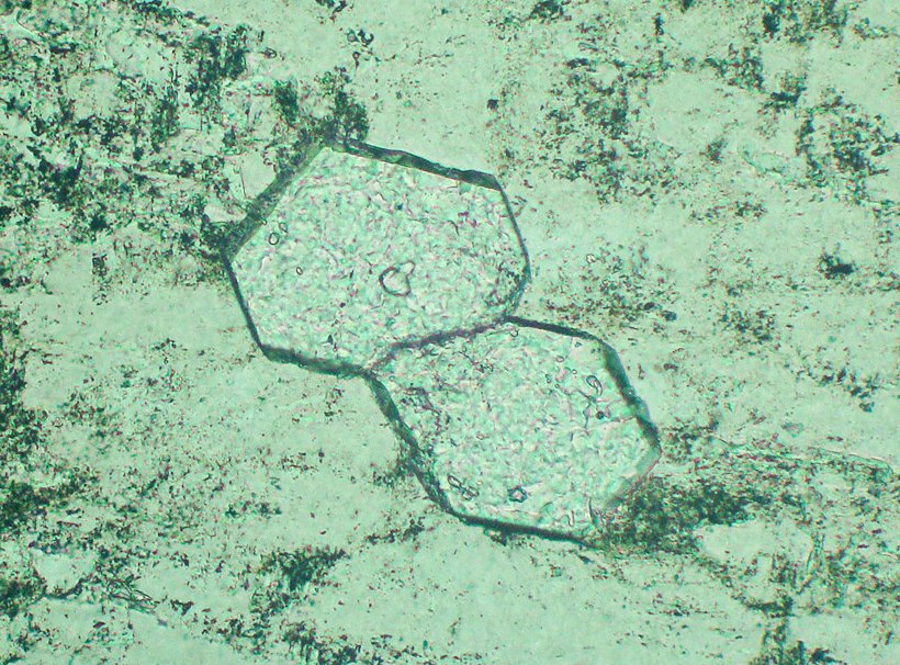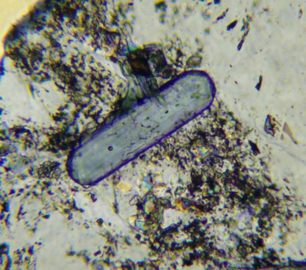 Color / Pleochroism: Colorless. Very rarely it is pale blue or pale gray with weak pleochroism. Apatites with higher U or Th contents, when included in biotite or hornblende, generate dark (black) halos (zones, coronas) around them.