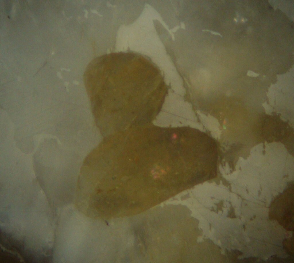 Internal reflections: Generalized, very luminous, in the same color as in hand specimen. Generally clear, colorless, milky to yellow, may be bluish.