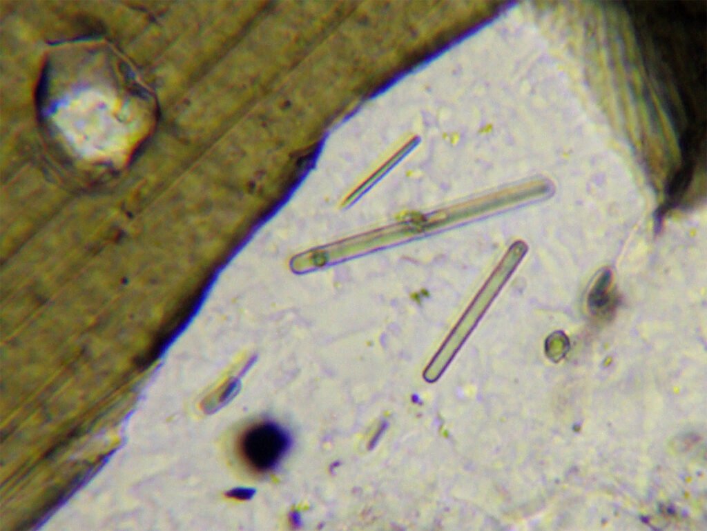 Habits: Euhedral, long prismatic (“rods”) with rounded tips and hexagonal sections, fibrous aggregates, radiated. If it occurs as inclusions in biotite and hornblende it has dark pleochroic halos.