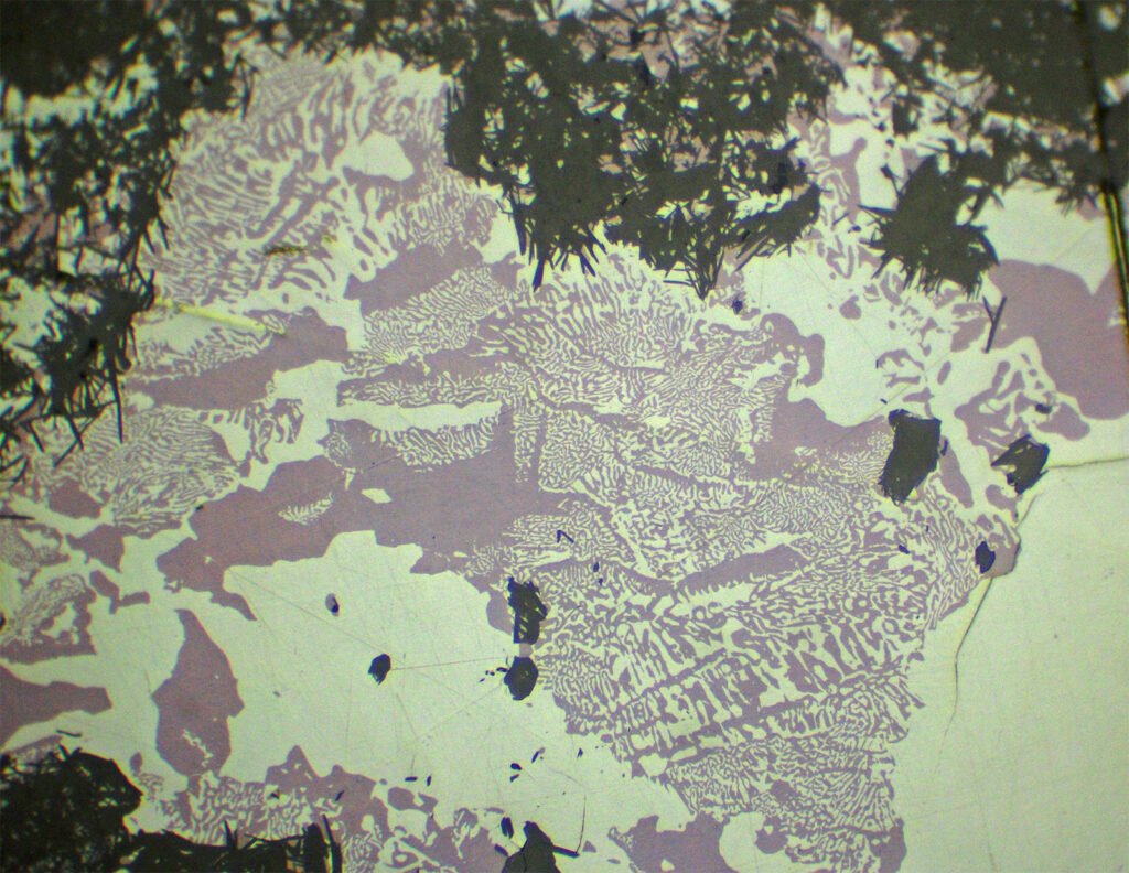 The surfaces of the polished sections (and hand samples) of the collections change slightly due to the formation of a brown crust of CuS. Leaving the sections exposed to the humid atmosphere, an air corrosion (turbidity) develops on their surfaces, which shows possible existing structures in the chalcocite.