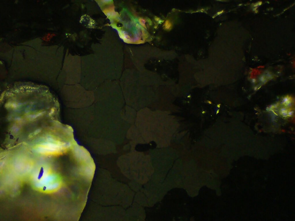 Isotropy / Anisotropy: Weak to distinct anisotropy, between emerald green and light pink, difficult to observe with exactly crossed nicols.
