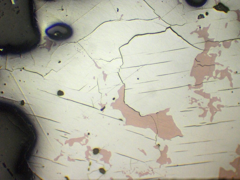 Usually the surface is heavily scratched, especially when there are small (hard) grains of pyrite embedded in the chalcocite. Careful polishing is required and long polishing should be avoided because they produce too high relief in the associated minerals and because the chalcocite surface is smudged due to the exaggerated surface film. To avoid this chalcocite surface blurring, it should never be polished dry or under high pressure. Too much pressure produces surface films on the chalcocite that later darken to blue colors. In addition, polishing grooves produced with coarse abrasives (which should be avoided in chalcocite ores) and which were not eliminated during polishing, are filled with mineral paste during the polishing process, appear bluer than the correct reflection color. and can generate pseudo-structures.