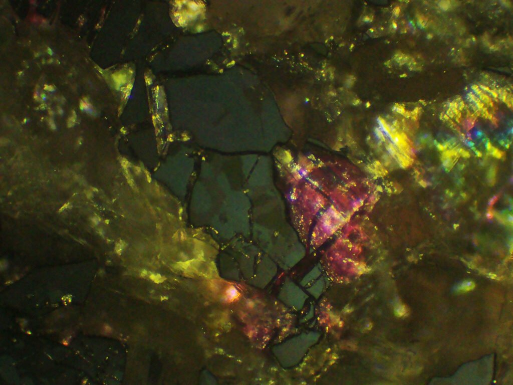 Birefringence and Interference Colors: Maximum birefringence of 0.073, corresponding to colors of up to 4th order, dominating pink and green colors, masked by the strong own color of the mineral.