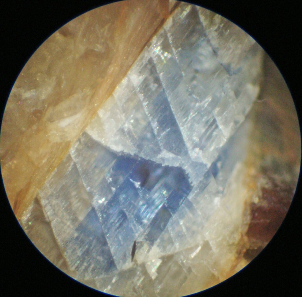 Internal reflections: Abundant, very colorful and bright. In some cases only milky, depending on the orientation of the cleavages in relation to the plane of the polished section. When the kyanite has an intense blue color, the internal reflections appear in various shades of blue, depending on the thickness of the kyanite crystal present in the polished section.