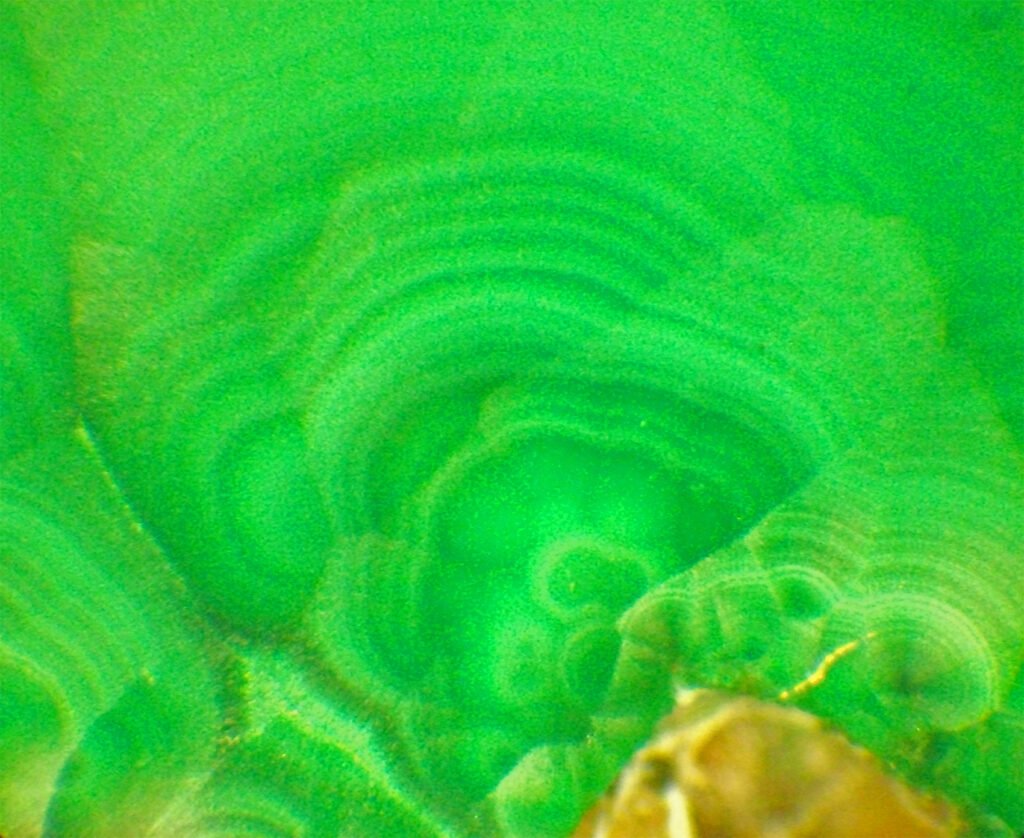 Internal reflections: Generalized, abundant and luminous in green, giving rise to any structures present.