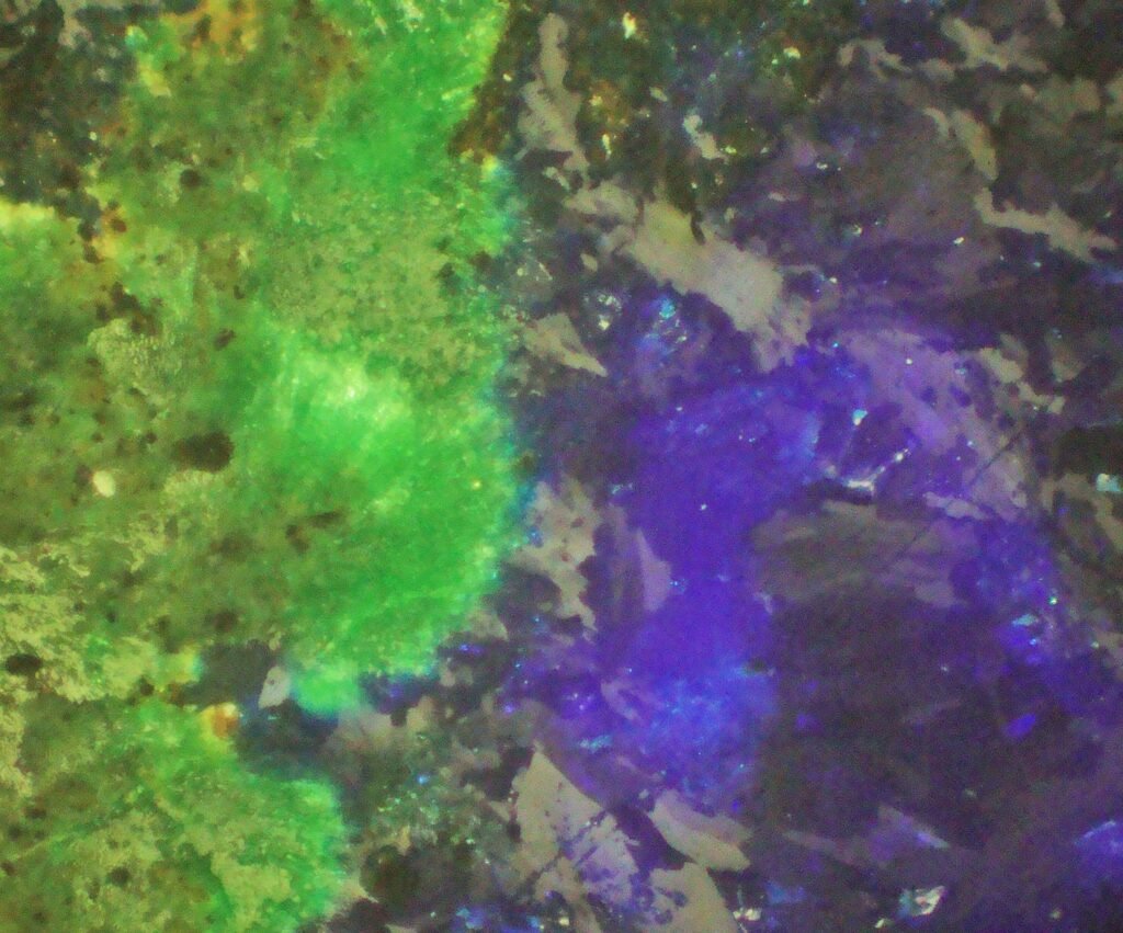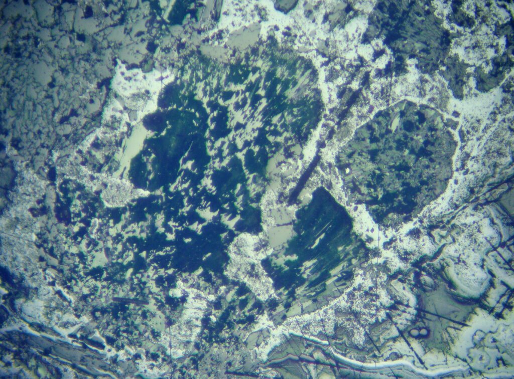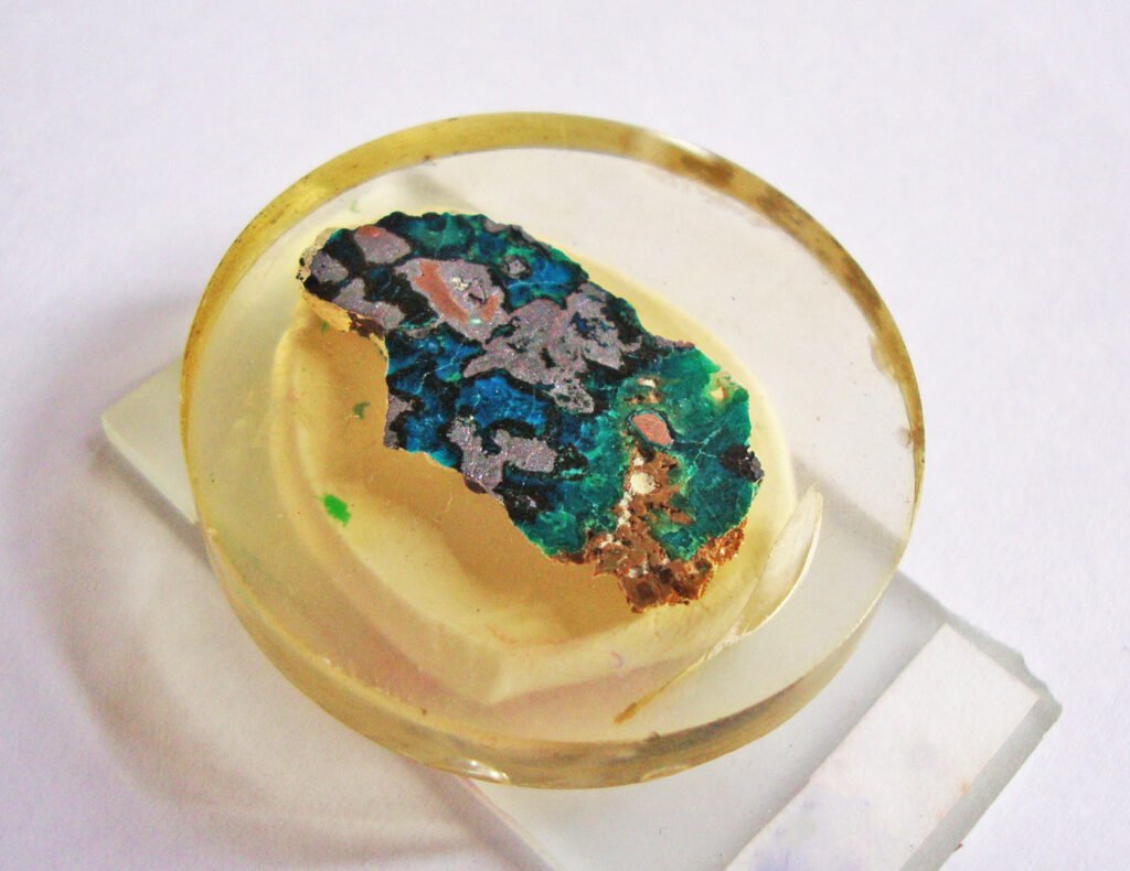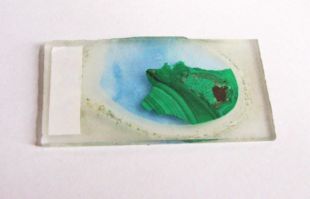 The preparation of a thin section of malachite requires only a rough grinding of the mineral, otherwise the malachite becomes so smooth that it peels off the glass slide. The glue simply does not adhere to the malachite and the thin section is rendered useless during the grinding step.
