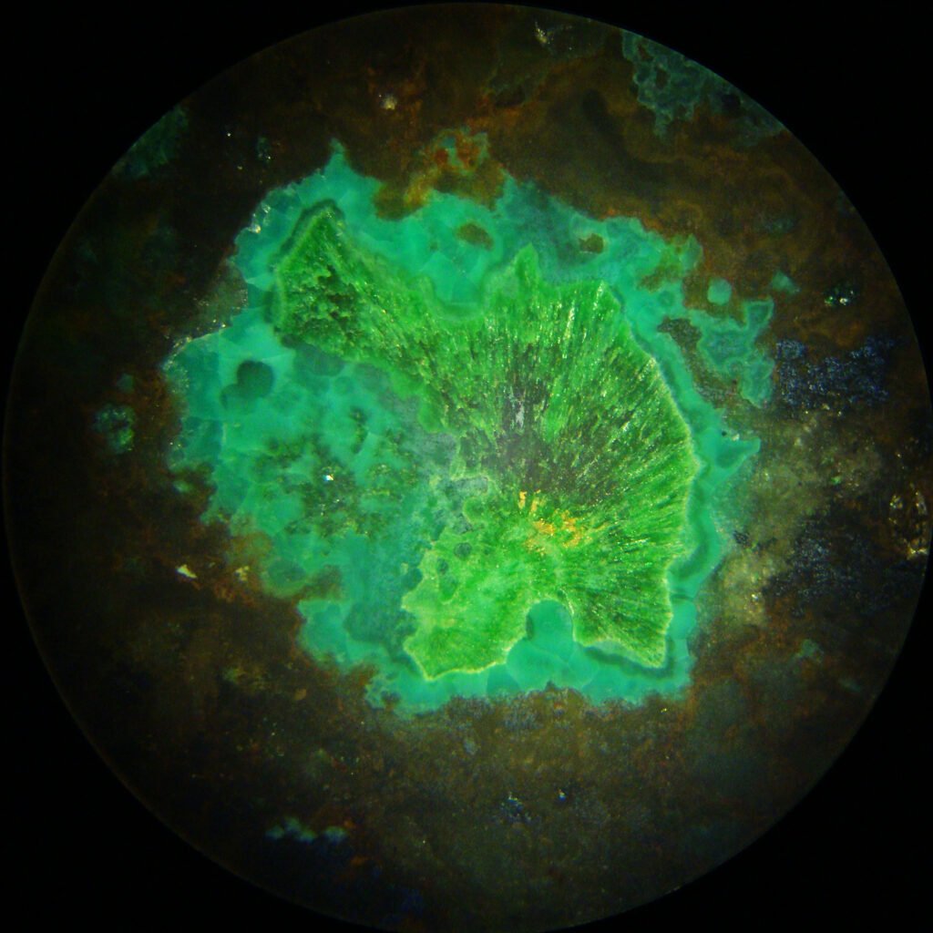 Several of them can present great color variations, from green to light blue, for example. Furthermore, malachite is associated with quartz, native copper, cerussite, calcite, “limonite”, chalcedony and many rare minerals such as duftite, auricalcite, sphaerocobaltite, kolwezite, shattuckite, chalcophyllite, conicalcite, rosasite, chalcosiderite, clinoclase, graemite, liroconite, mixite and cornetite, among many others.
