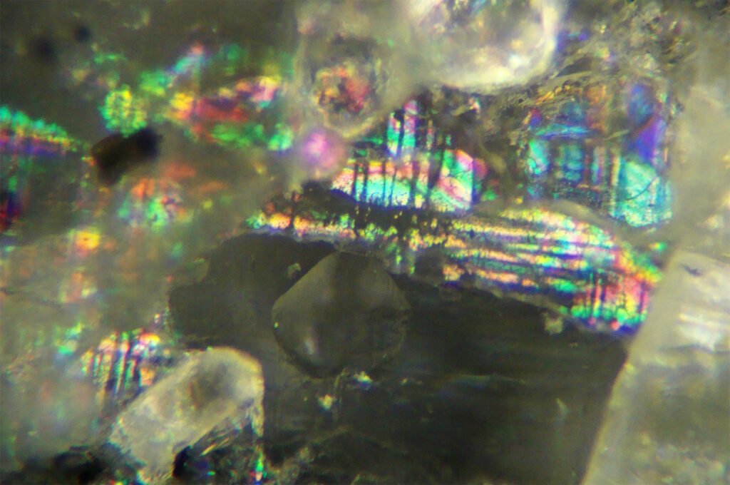 Reflection color: Dark gray, as quartz, plagioclase and other feldspars.