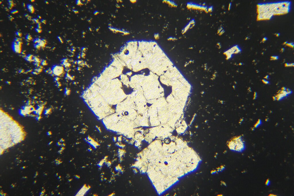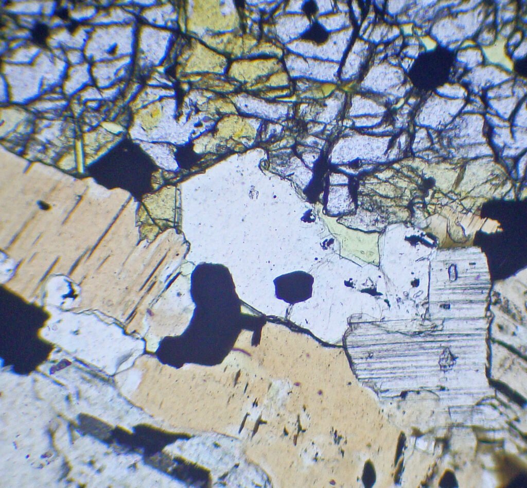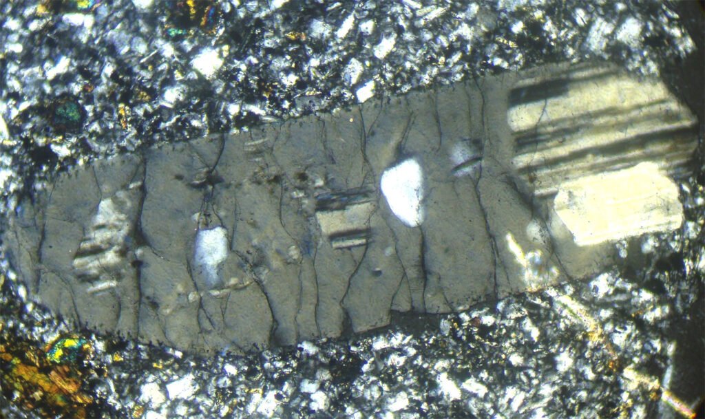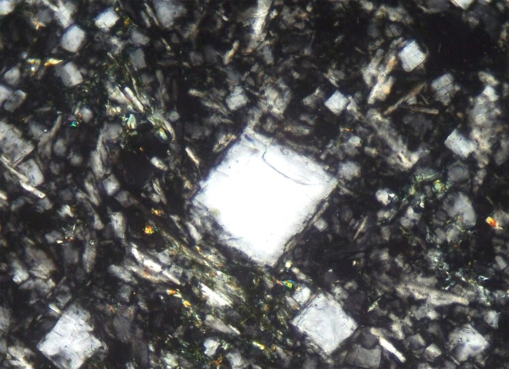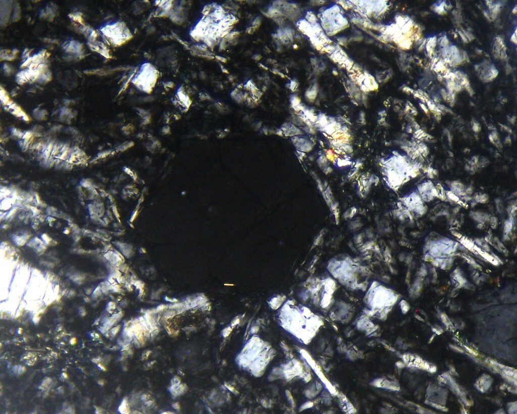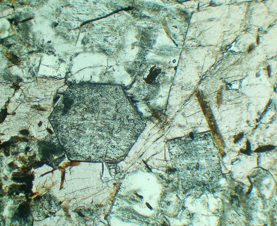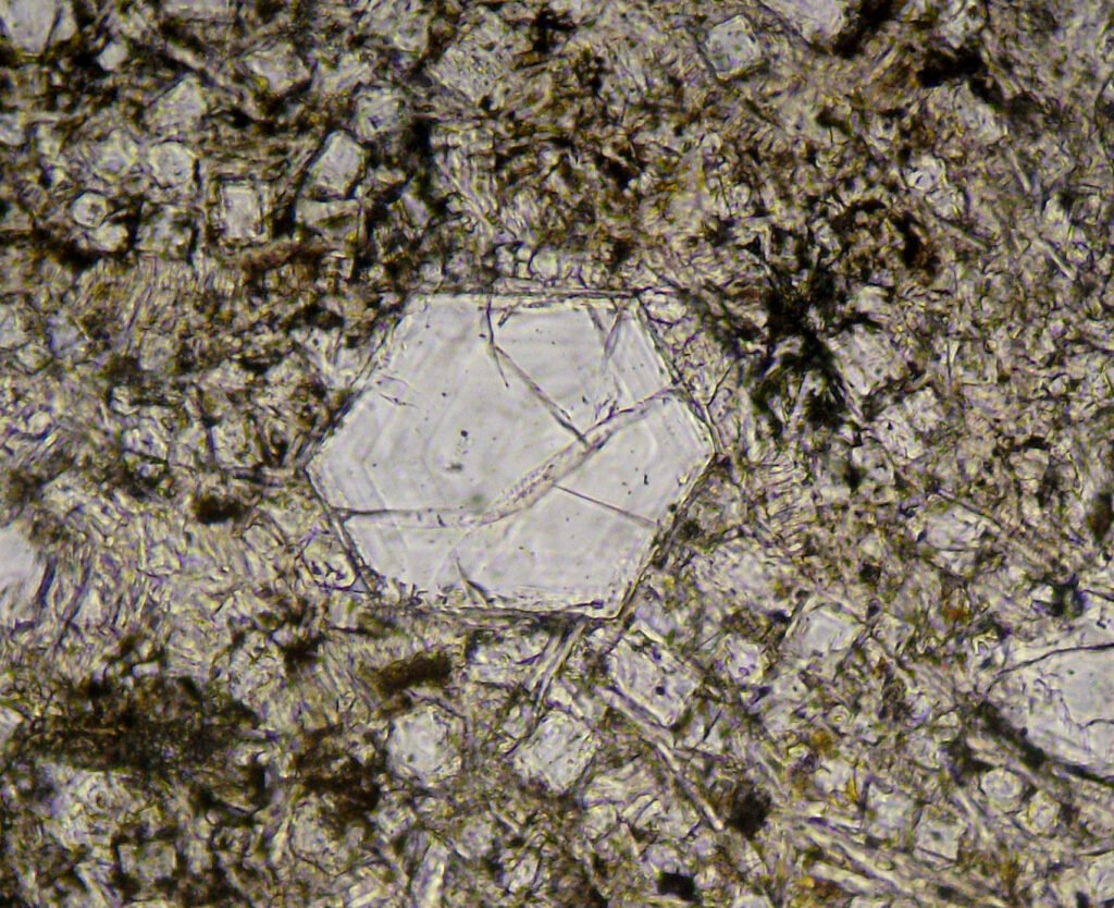 Habits: Usually in anhedral, interstitial masses. In volcanic rocks, it can form short hexagonal prisms, with square or hexagonal basal sections. It also occurs in equidimensional or columnar grains. May have inclusions and sub-grains.