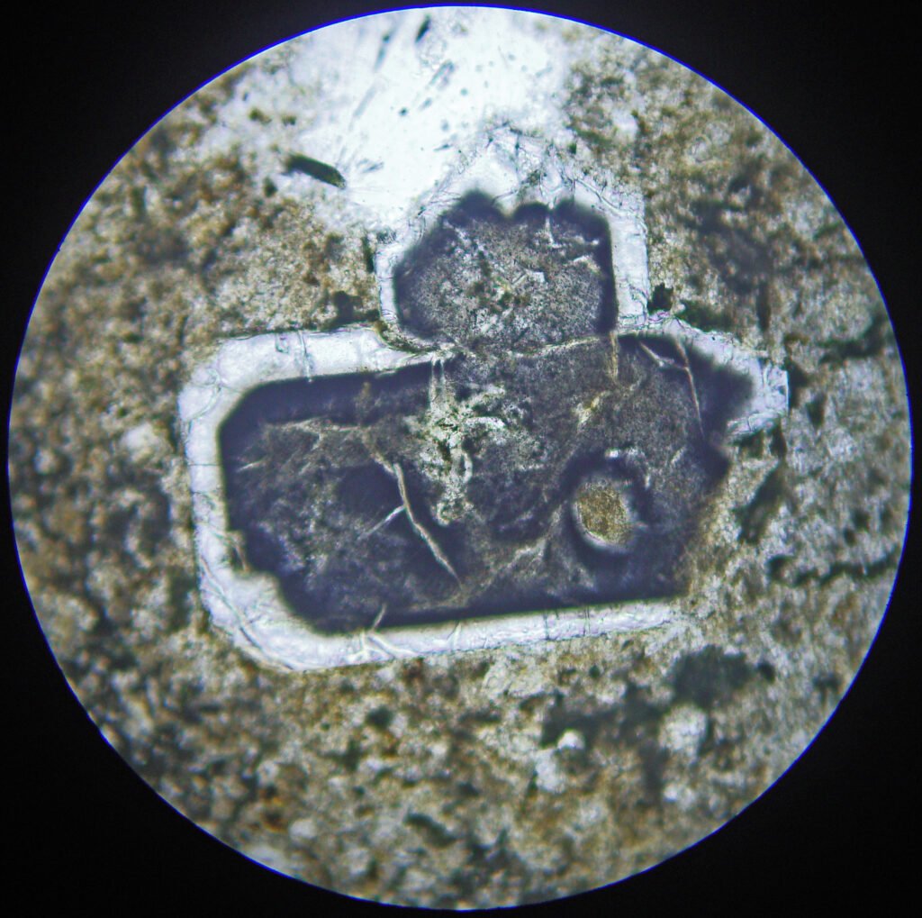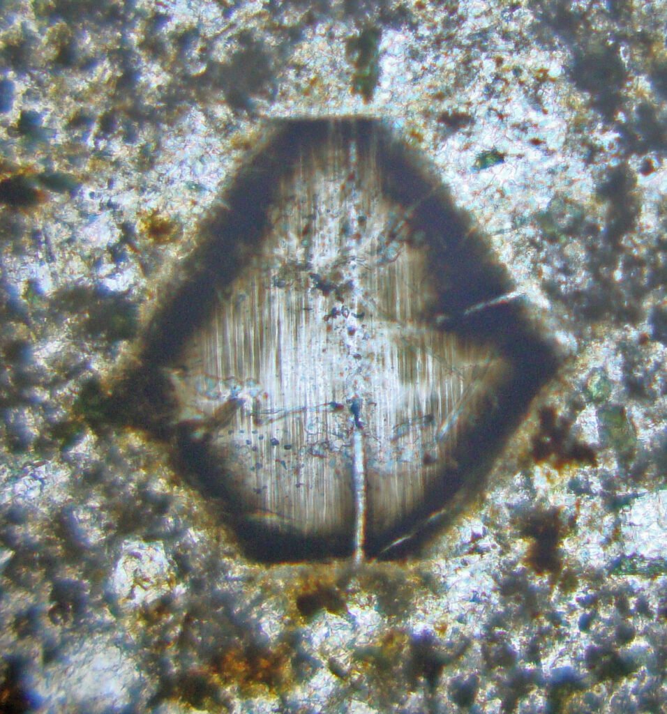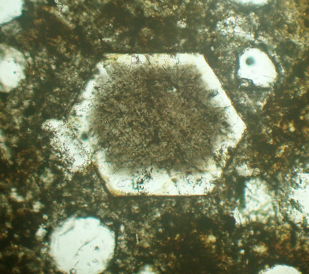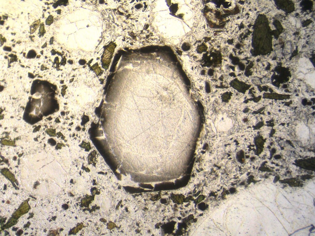 Haüyne is normally blue (pale or strong) on a thin section and usually contains dark inclusions that may be concentrated in sectors, planes, cores or edges.