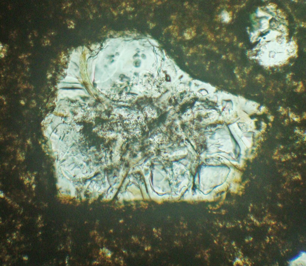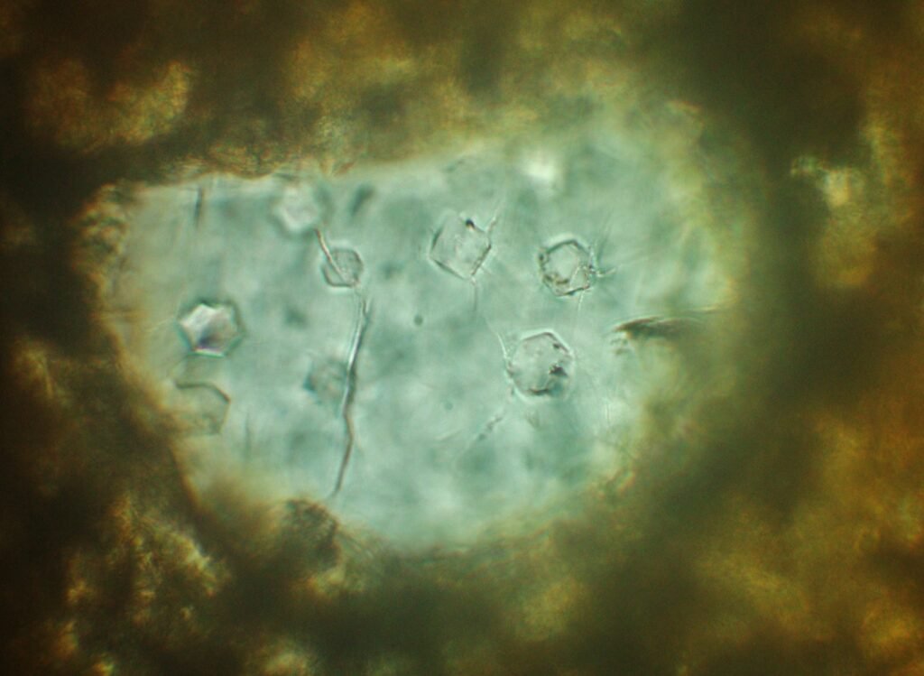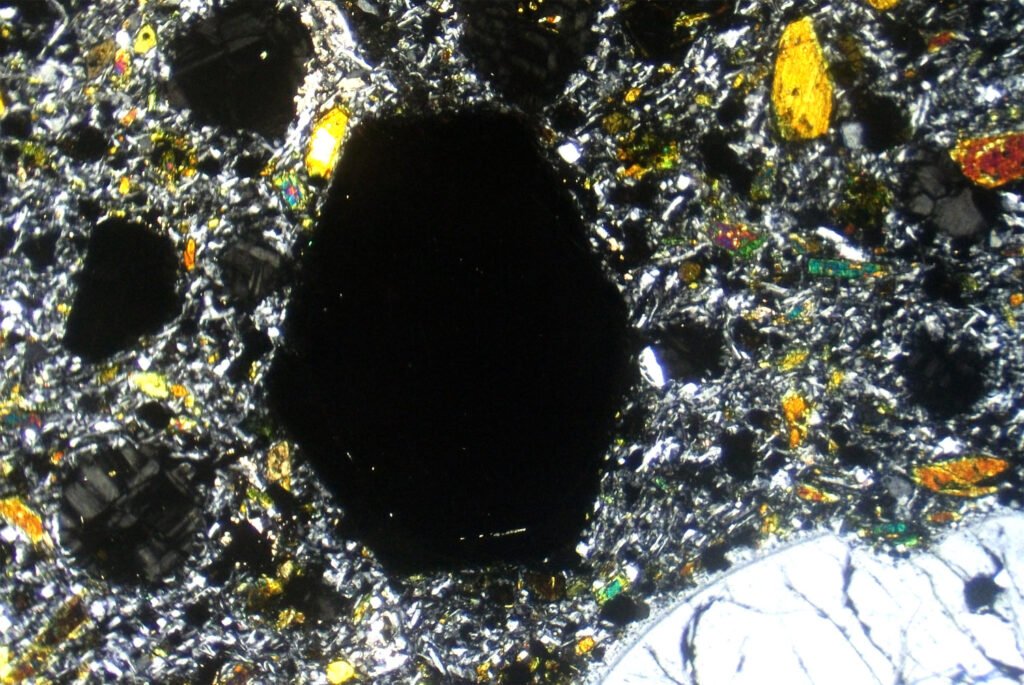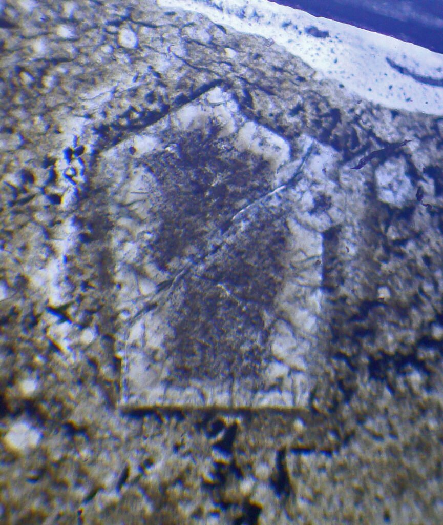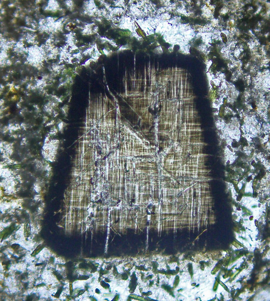 Haüyne is normally blue (pale or strong) on a thin section and usually contains dark inclusions that may be concentrated in sectors, planes, cores or edges.