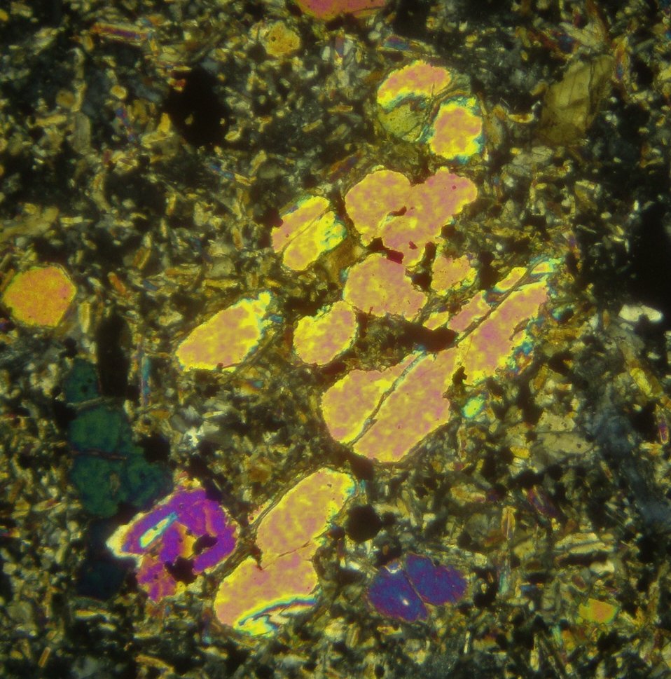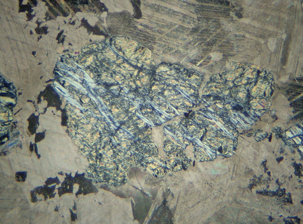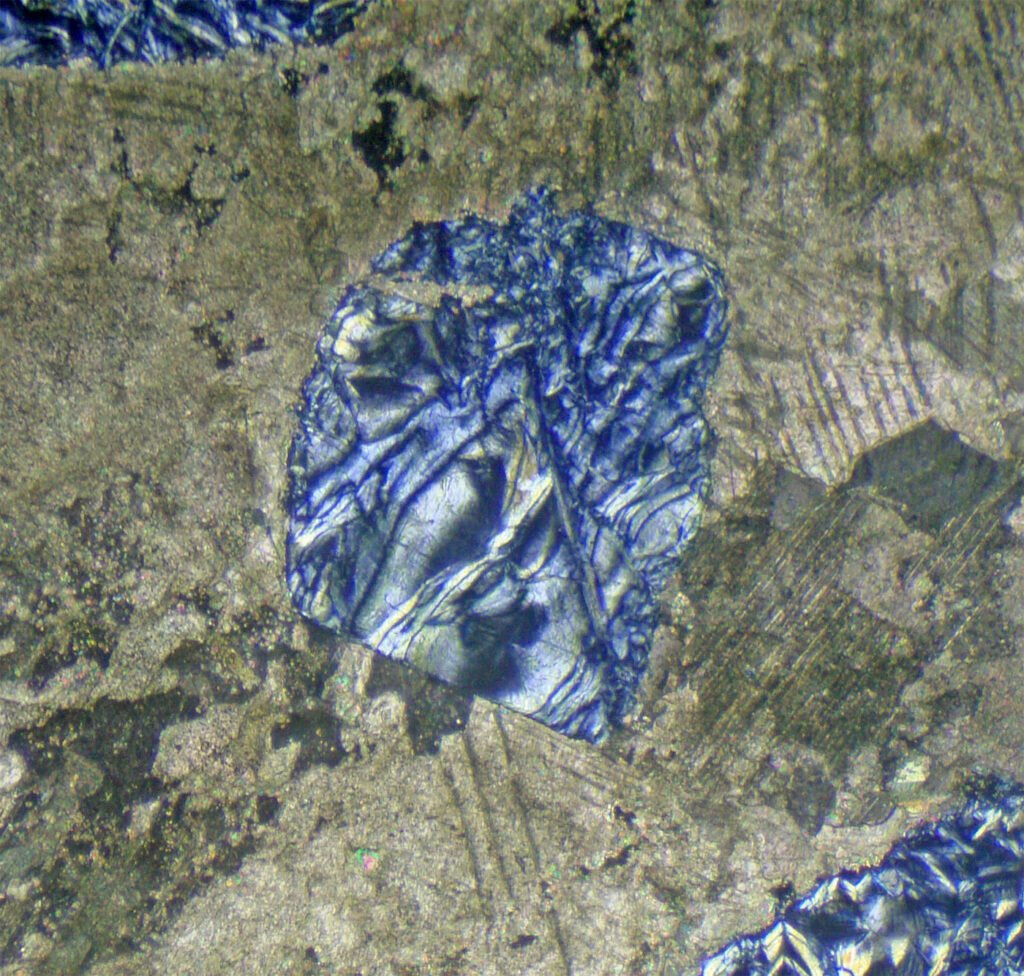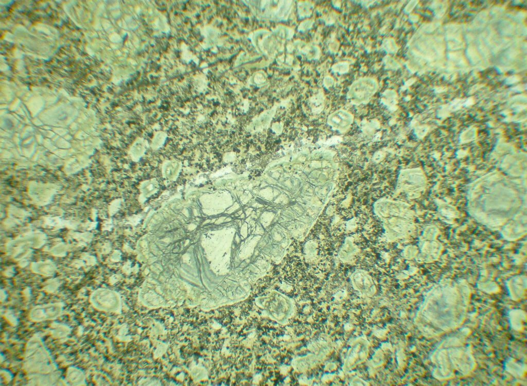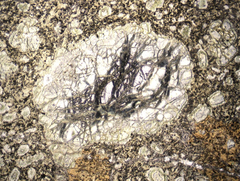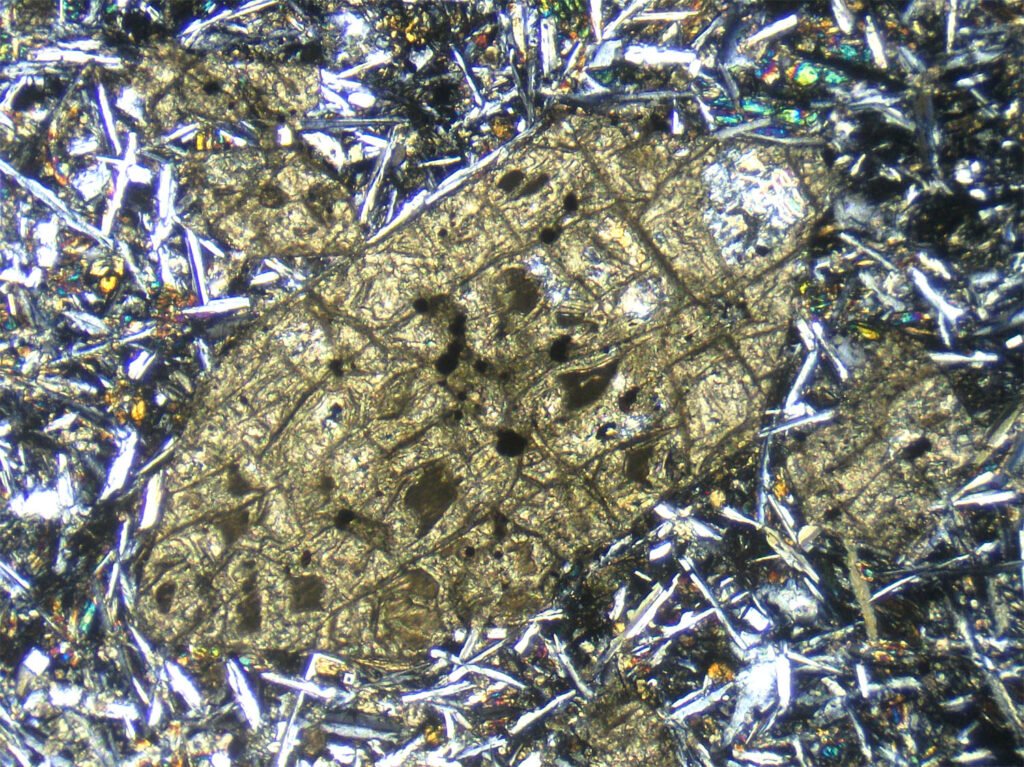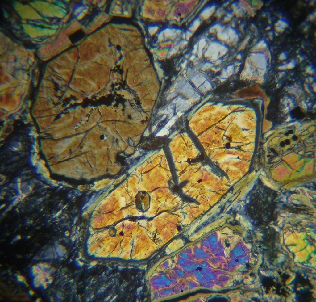 Habits: Anhedral crystals, more rarely subhedral, always tending to roundish. In volcanic rocks it can form euhedral prismatic phenocrysts, with hexagonal or octagonal sections. In glassy volcanic rocks it can be skeletal. In komatiites it can be acicular (“spinifex” texture). Fractures are usually abundant, very irregular, containing alteration materials (“iddingsite” and/or various others).