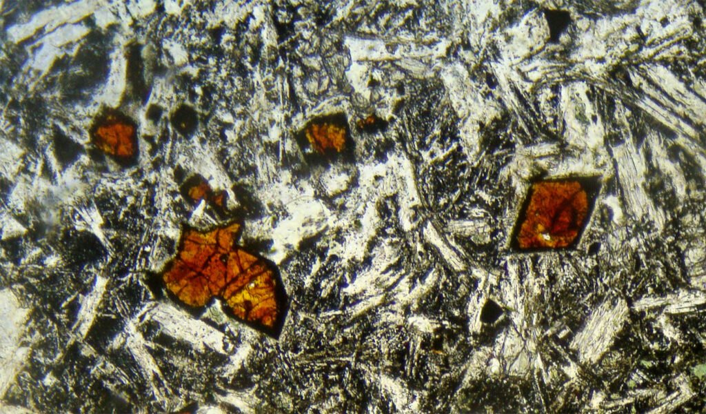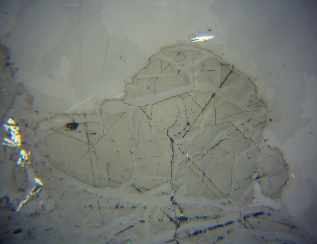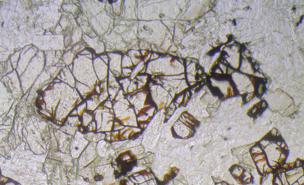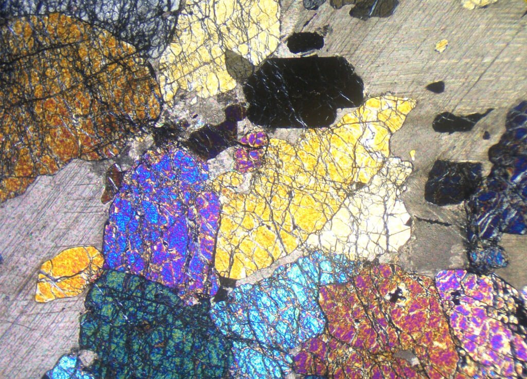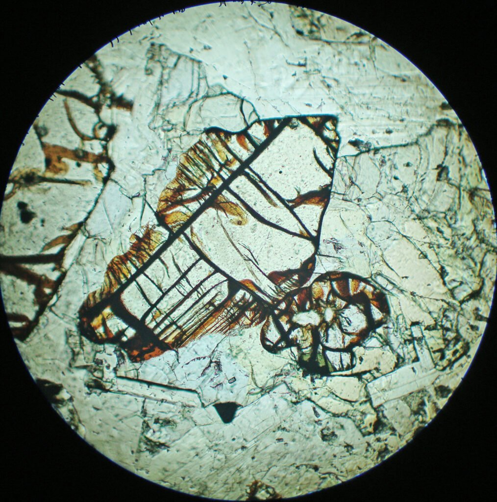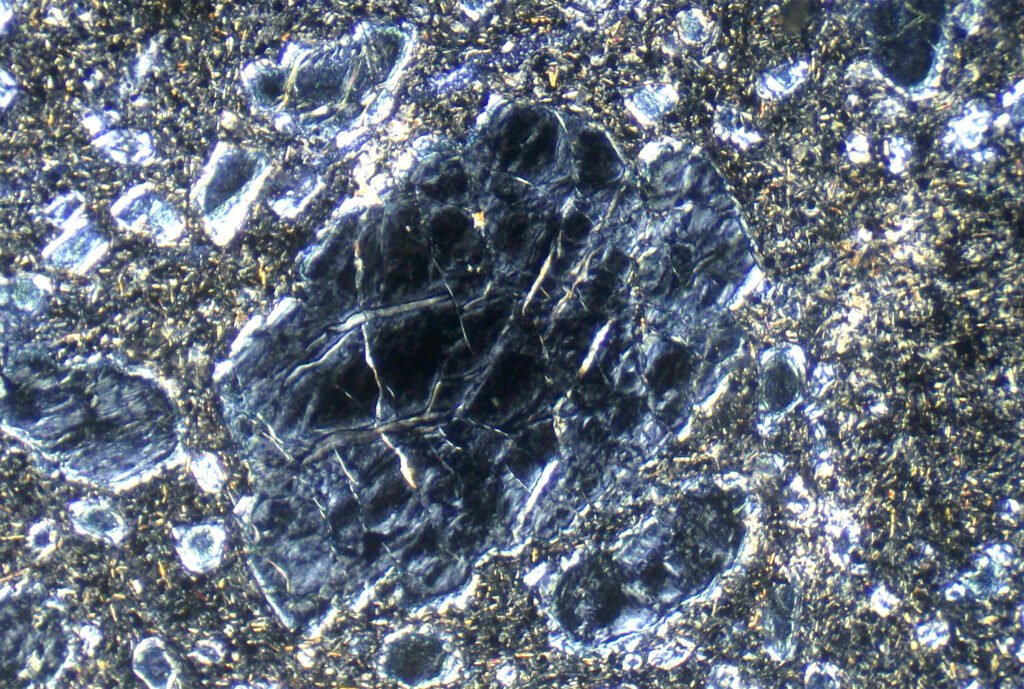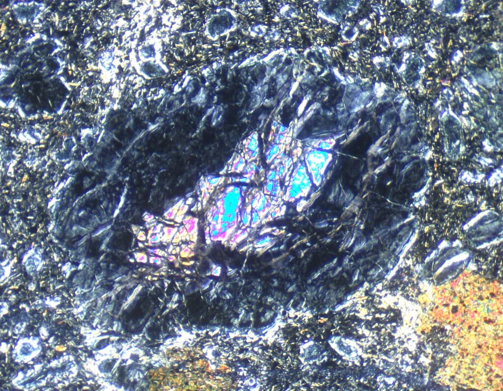 Habits: Anhedral crystals, more rarely subhedral, always tending to roundish. In volcanic rocks it can form euhedral prismatic phenocrysts, with hexagonal or octagonal sections. In glassy volcanic rocks it can be skeletal. In komatiites it can be acicular (“spinifex” texture). Fractures are usually abundant, very irregular, containing alteration materials (“iddingsite” and/or various others).