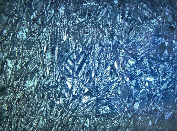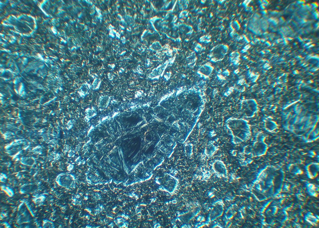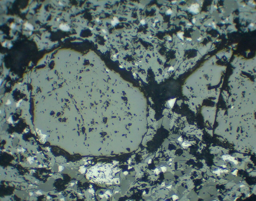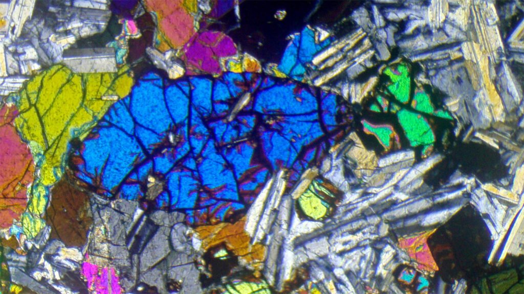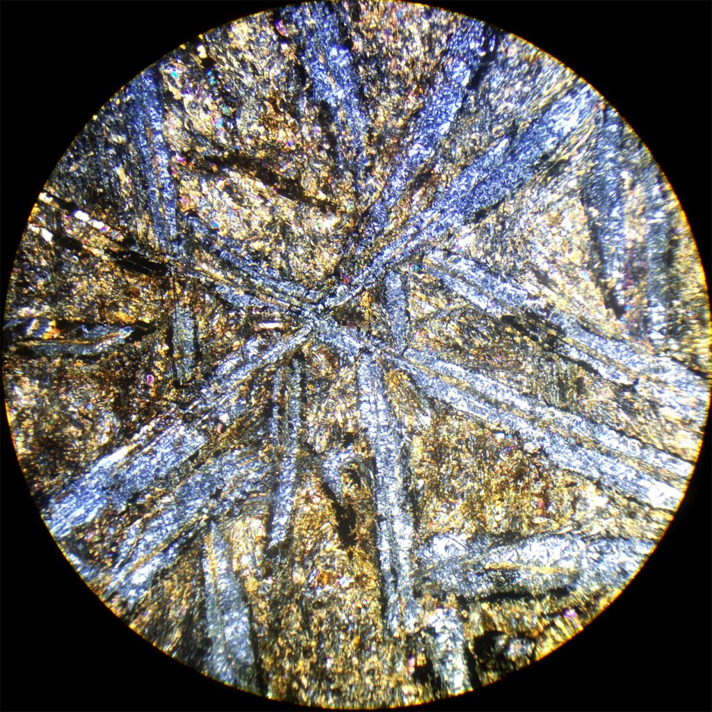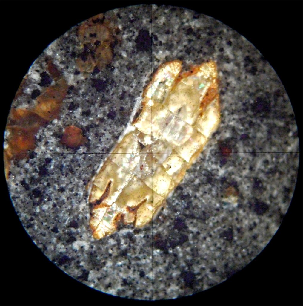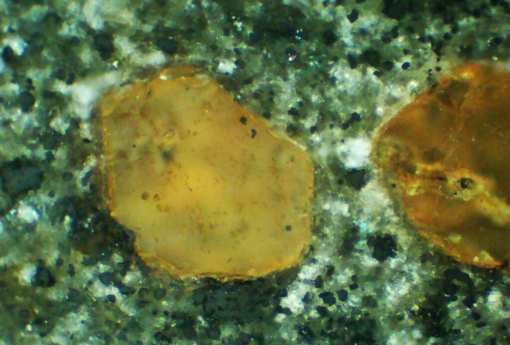 Habits: Anhedral crystals, more rarely subhedral, always tending to roundish. In volcanic rocks it can form euhedral prismatic phenocrysts, with hexagonal or octagonal sections. In glassy volcanic rocks it can be skeletal. In komatiites it can be acicular (“spinifex” texture). Fractures are usually abundant, very irregular, containing alteration materials (“iddingsite” and/or various others).