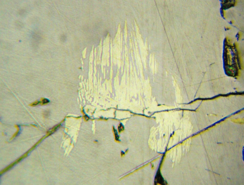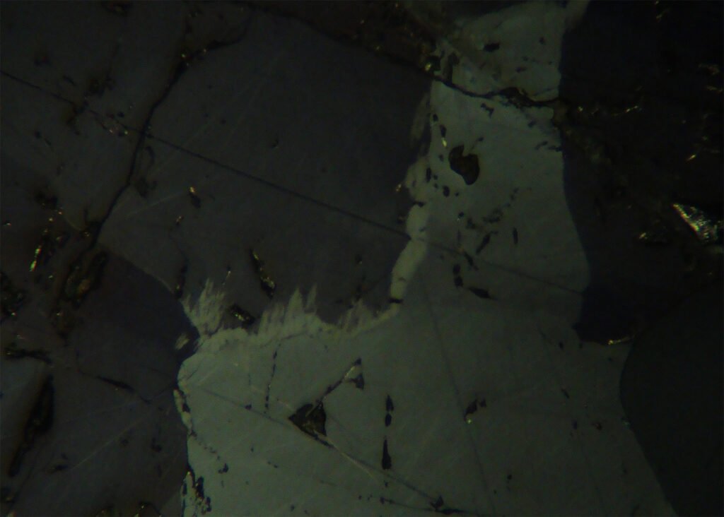 Octahedral (111) parting is usually visible in the polished section (3 directions forming equilateral triangles), often in excellent form, including the formation of triangular polishing pits, mainly in larger grains. The parting can become more pronounced, more prominent, due to the formation of violarite (ND: creamy violet, NC: isotropic) or bravoite (ND: creamy-brown violet, NC: isotropic) along its edges. Violarite can also appear along fractures and polishing pits.