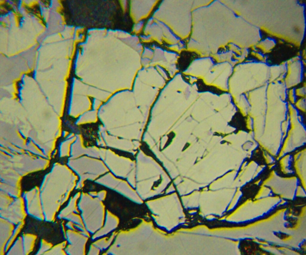 Grain shape: In the vast majority of cases, pentlandite occurs xenomorphically, associated with pyrrhotite, forming cords, “flames,” bands, and fillings of intergranular spaces between rounded subhedral pyrrhotite grains, which is very characteristic. In isolated cases, pentlandite forms rounded grains with indications of octahedral shapes, often of appreciable sizes, even the size of a fist. Normally, the pentlandite grain or aggregate is much smaller, only 2 mm or less. The pyrrhotite grains that occur in association are even smaller, but are never extremely fine. In aggregates, the grains are rounded and have no serrated boundaries.