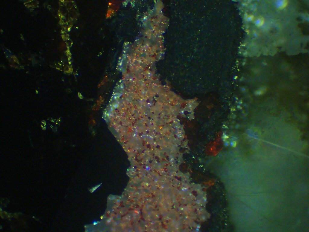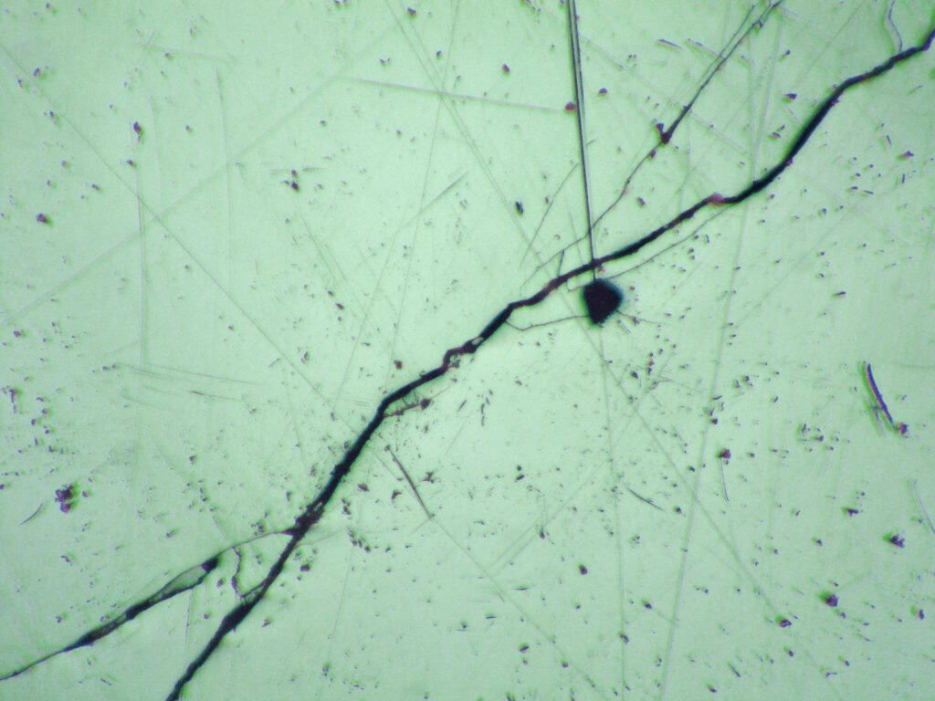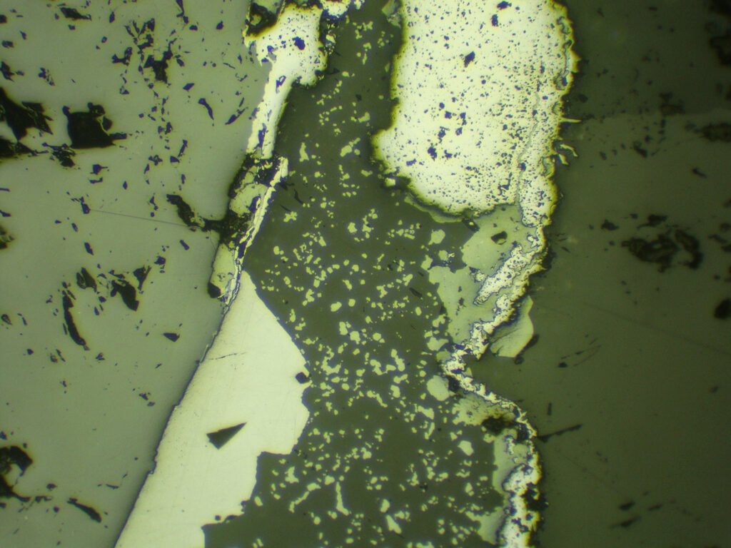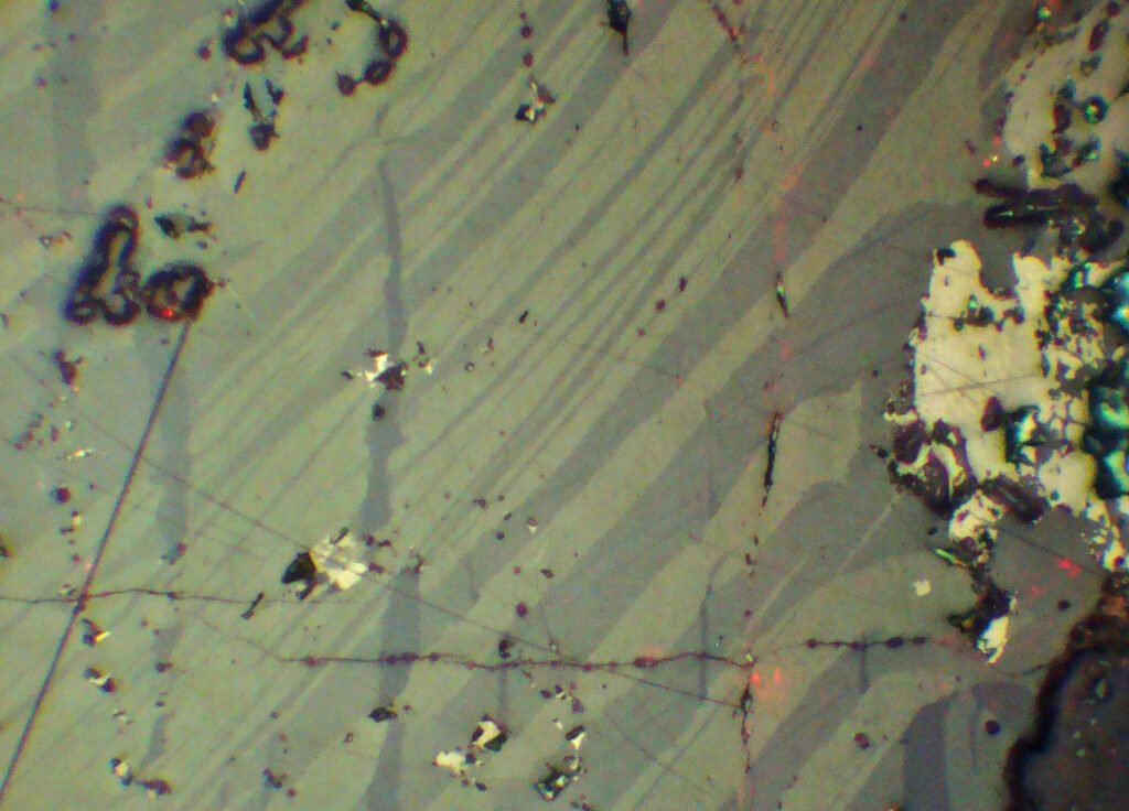 Dye the polishing cloth red. There are subtle hardness differences according to different orientations in the mineral. Light etching (corrosion) can be perceived discreetly in polished sections after 10 minutes of exposure: etching causes old polishing grooves to appear and its intensity varies greatly according to grain orientation.