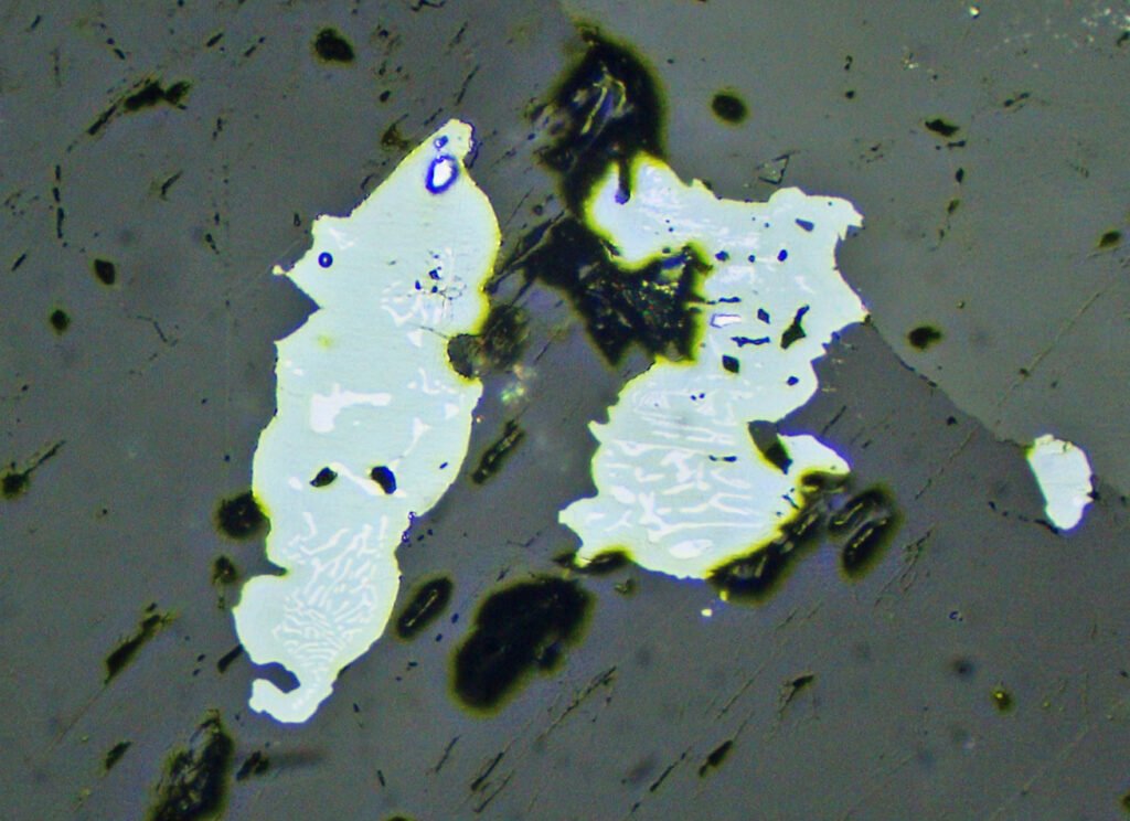Grain shape: well-formed isolated crystals are often observed, alongside chaotic aggregates with very irregular, intensely intergrown crystals (toothed contacts). Pyrargyrite often occurs as a filler of very fine fractures in both the ore and the host rocks, forming thin films that have the same orientation over long distances. The grain size is very variable, even in the crystals of an individual polished section.