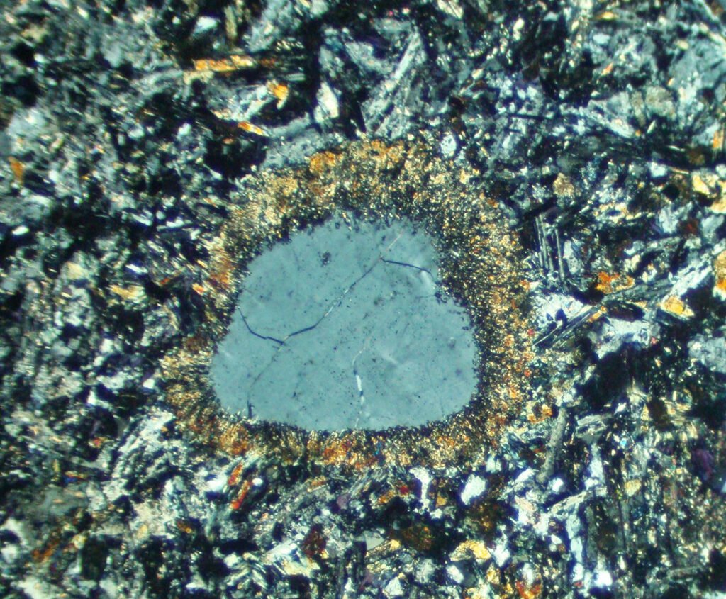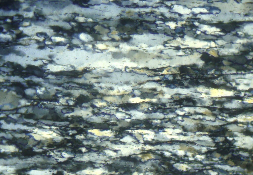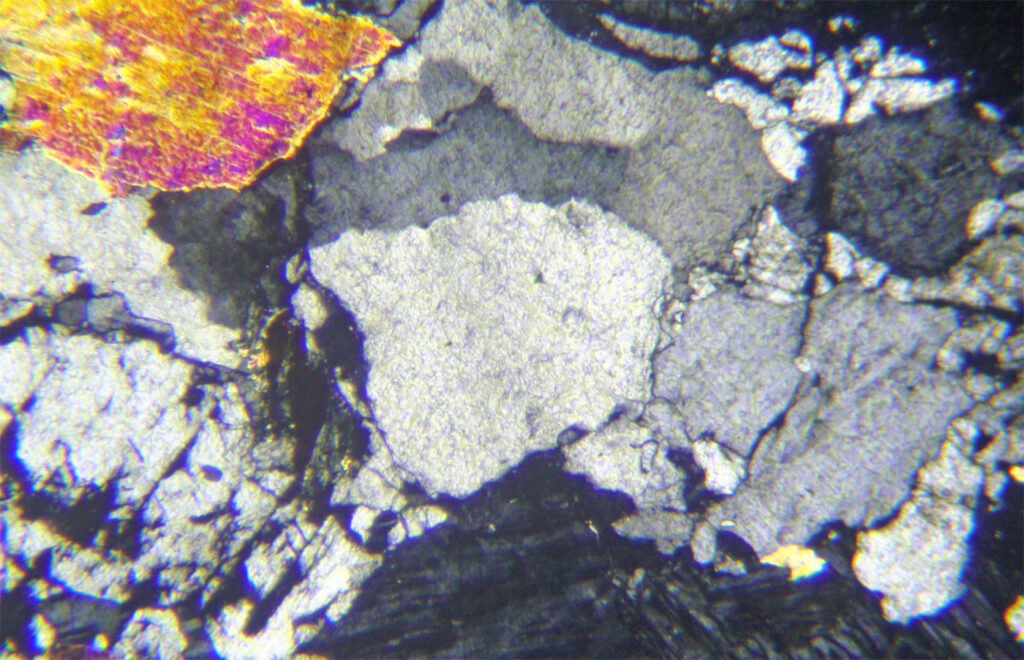 Extinction: Parallel to the prism. As the quartz grains are usually anhedral, this determination is rarely possible. Quartz very often presents undulating extinction because it is subdivided into subgrains.