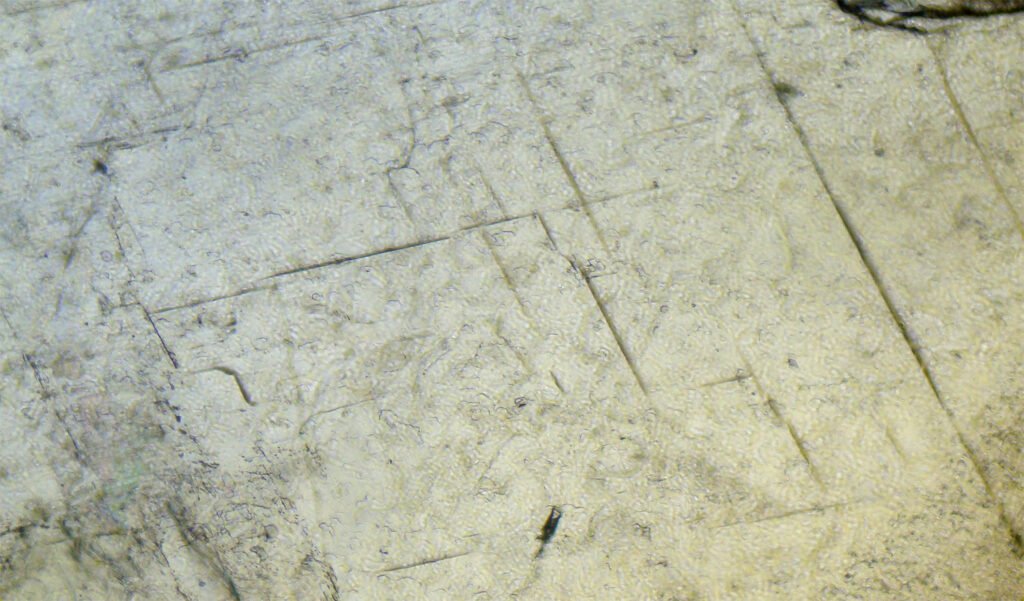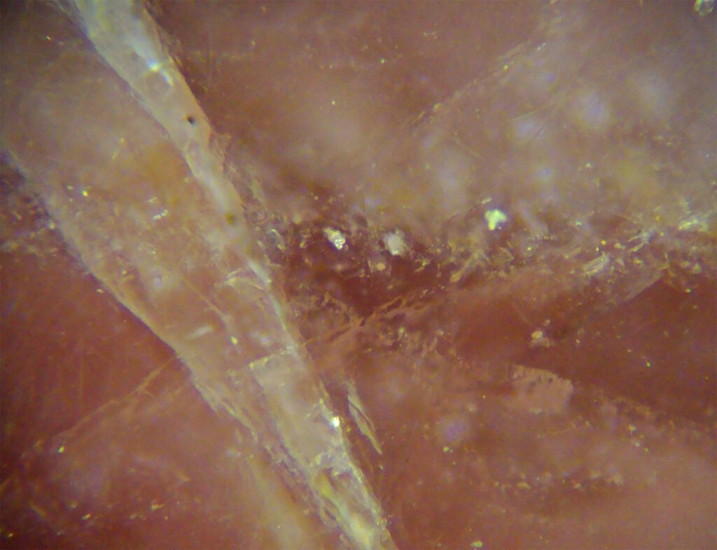 Triangular polishing pits may be present due to the excellent cleavage of rhodochrosite. These figures are very rare due to the excellent polish that rhodochrosite acquires. In addition, the figures are much less defined than those of galena, for example. They are irregular alignments of more or less geometric holes, often difficult to define.