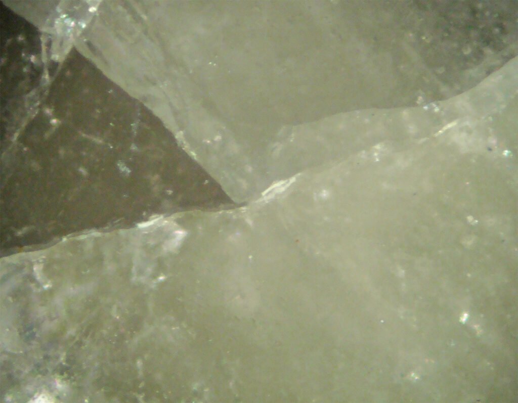 In this context, it is important to emphasize that its intense blue-white fluorescence is still present in the 30 micron thickness of the thin section, but only if the slide is without a coverslip. Coverslip cancels fluorescence.