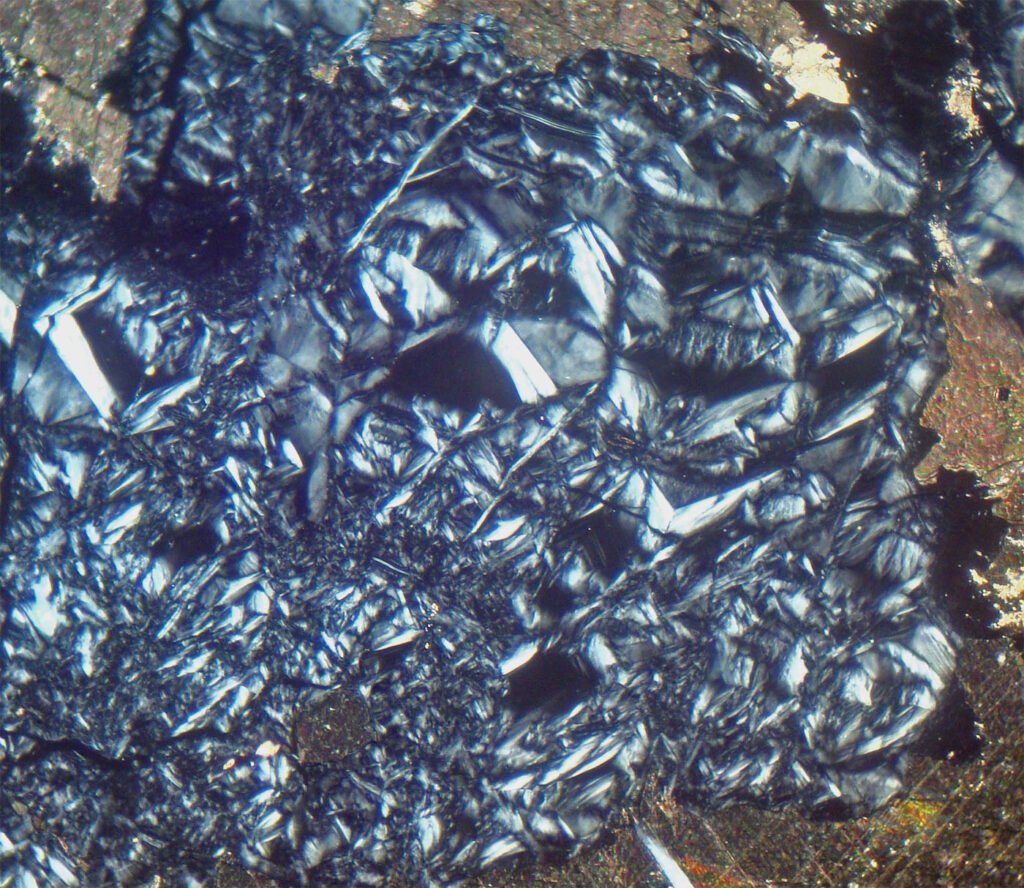 Habits: Anhedral, very small grains, asbestiform habit (fibers ± parallel), foliate, mesh texture (mesh texture in minerals altering serpentine), no pleochroic halos. Chrysotile is fibrous, lizardite and antigorite tend to be tabular, laminar crystals, but lizardite can also be fibrous.
