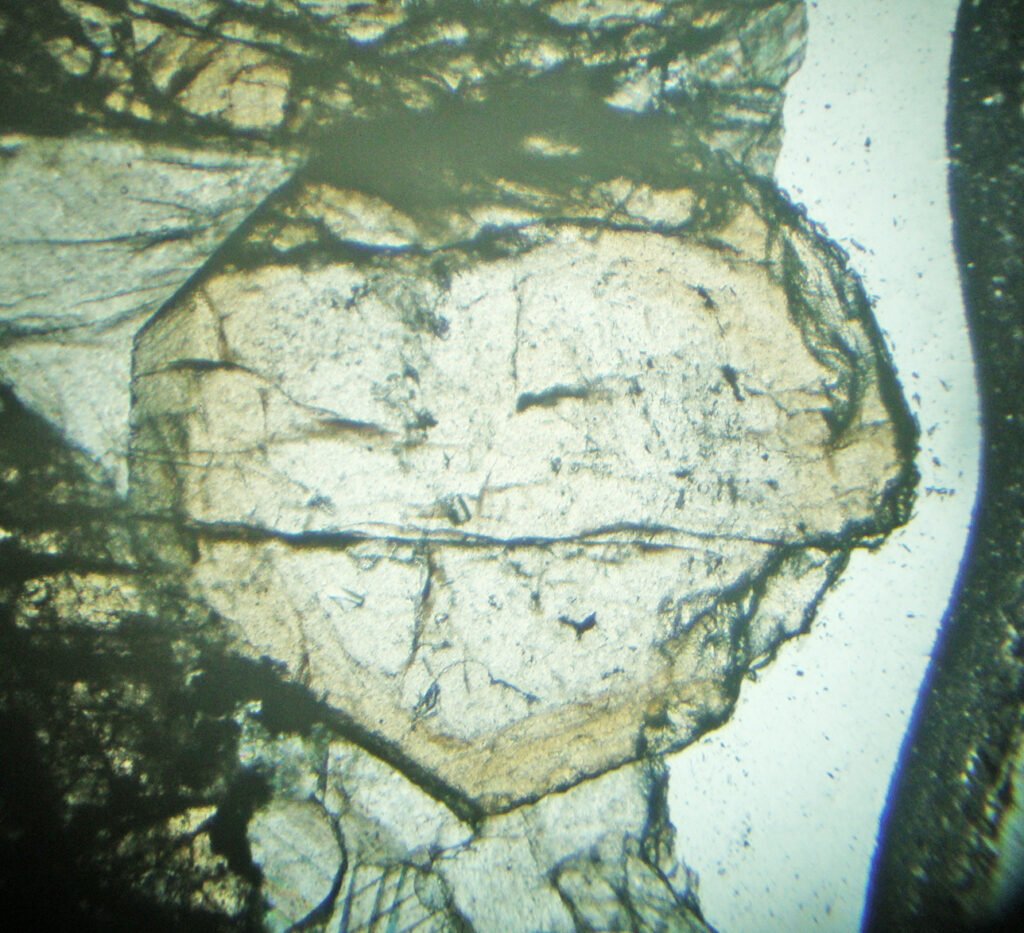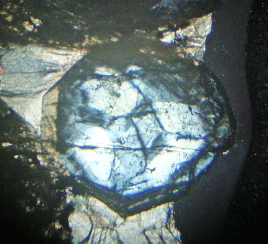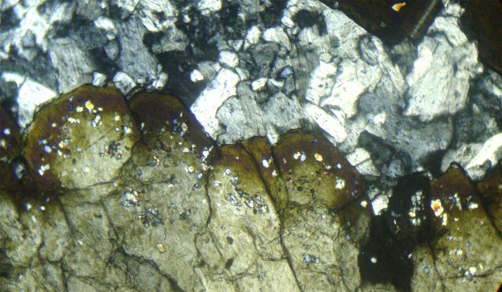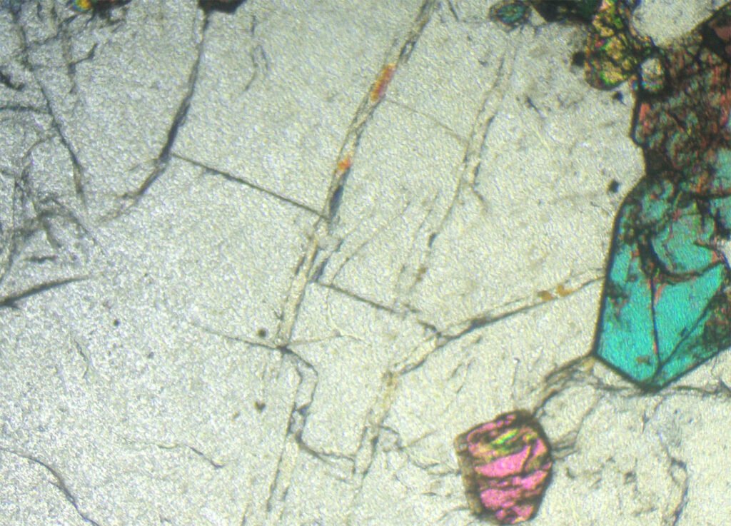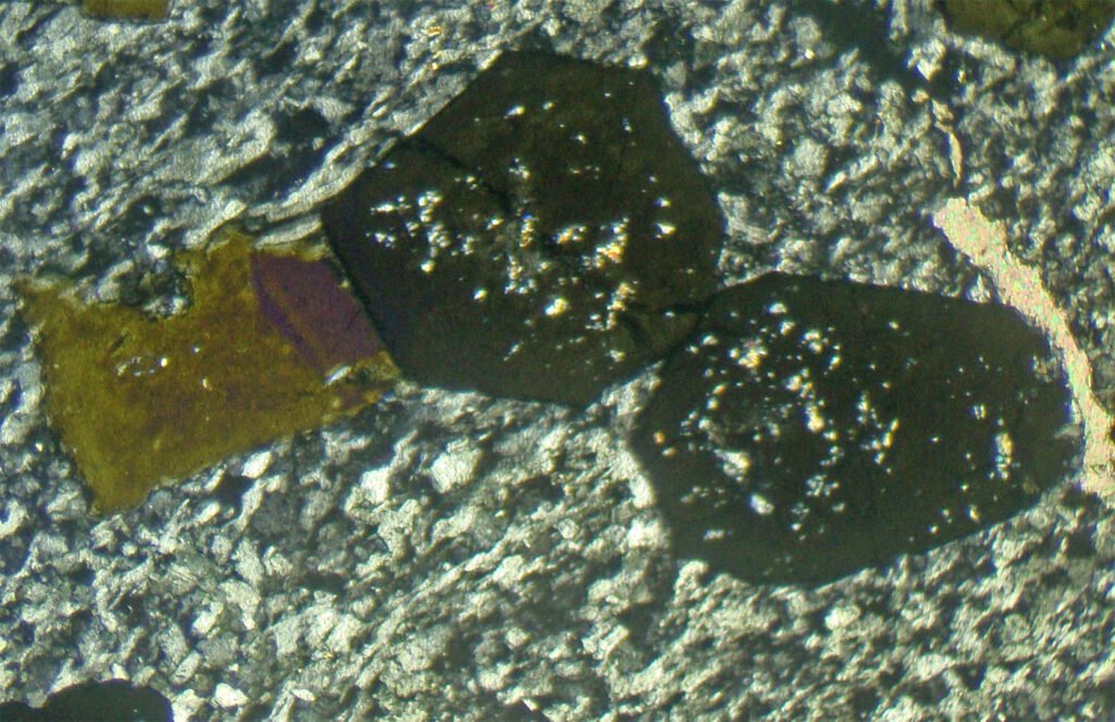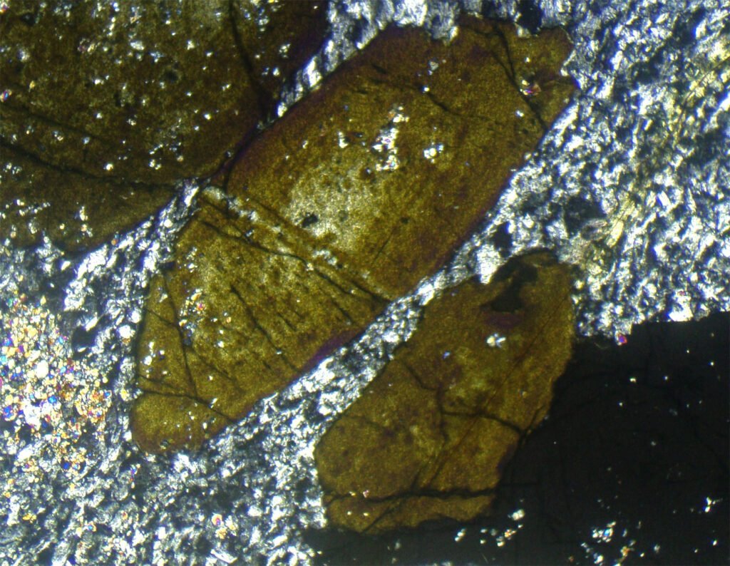Vesuvianite is a more difficult mineral to identify. Diagnostic features include high relief, absence of cleavage, low birefringence (gray colors), and, when present, anomalous interference colors distributed by sectors. Paragenesis is important: the presence of calcite and clinopyroxenes (diopside) suggests the possibility of vesuvianite occurrence.