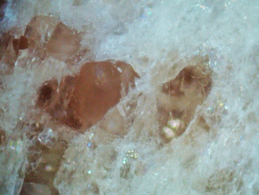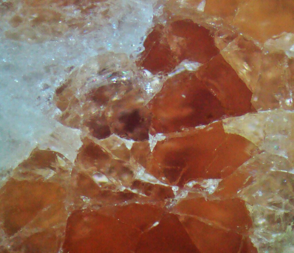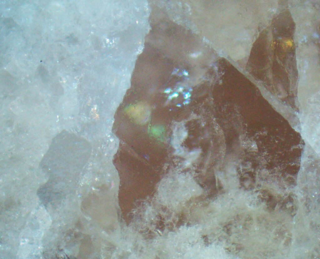 Internal reflections: Widespread in the same colors of the mineral in hand specimen, usually brown, may be yellowish to caramel. The thickness of the mineral at the point in question influences the intensity of the color: the thicker the grain, the more intense the color, and vice versa.