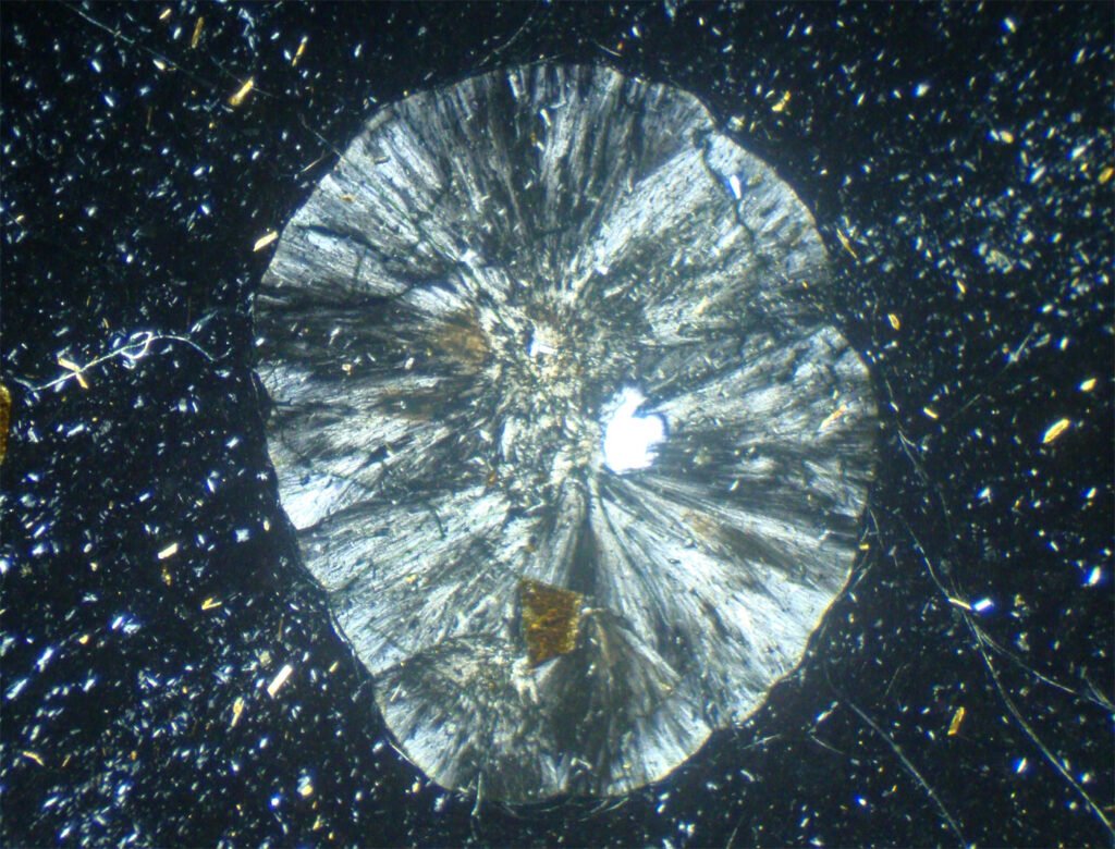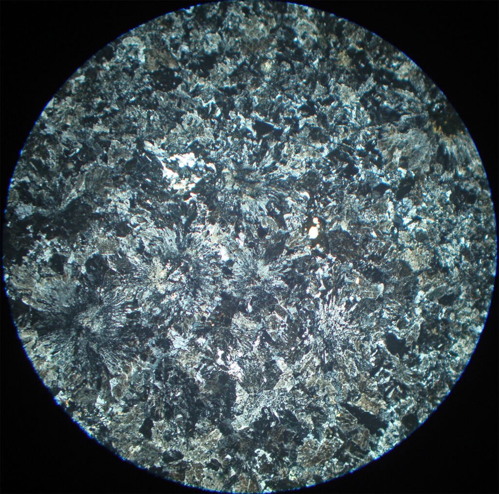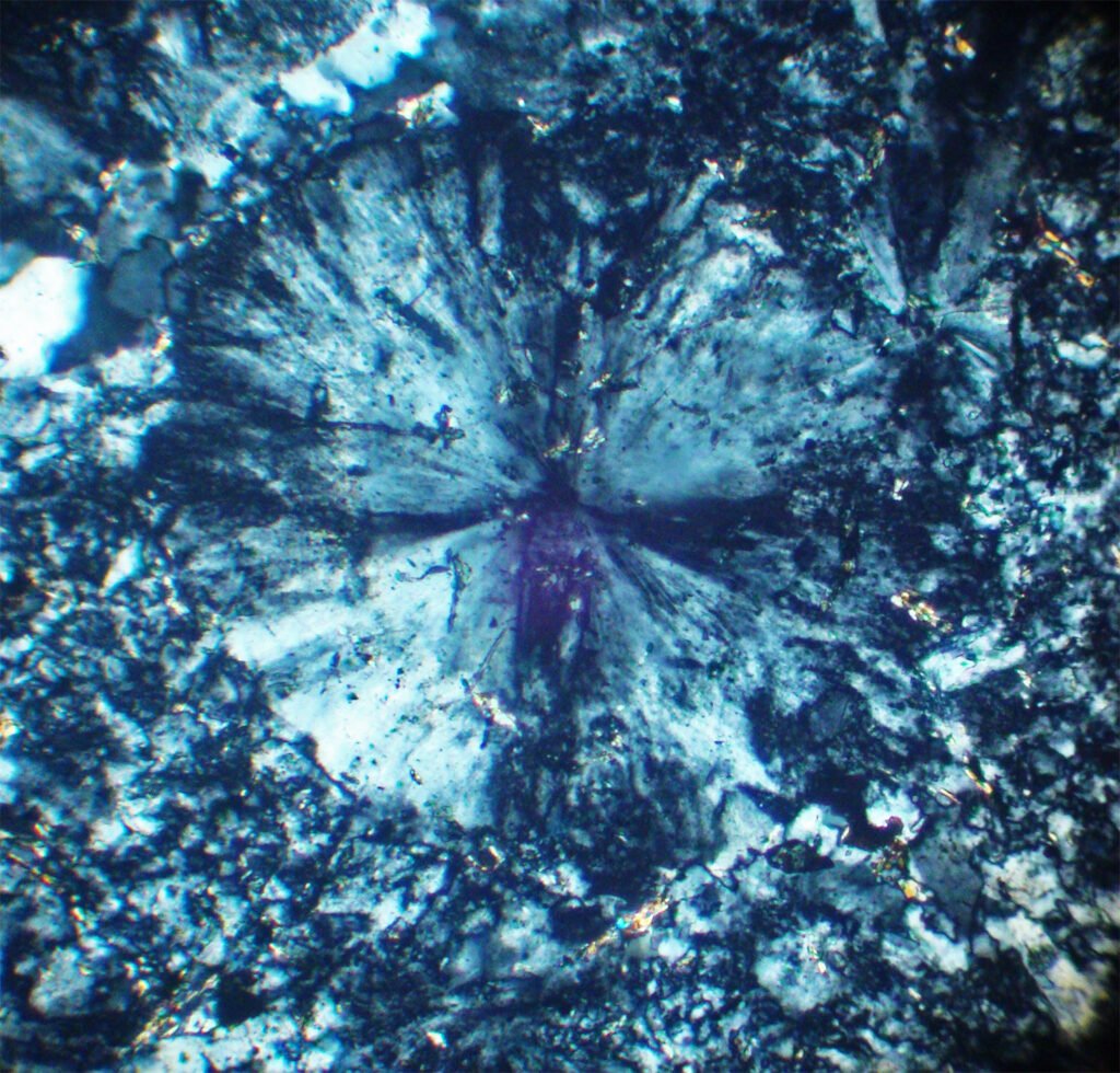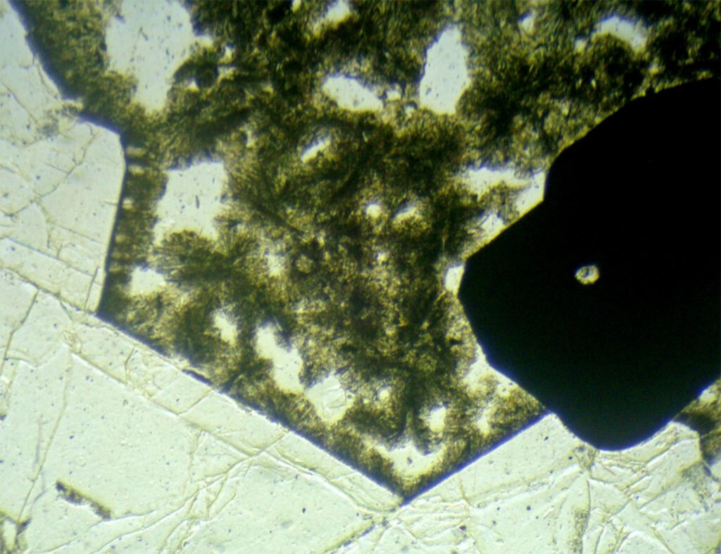 Isotropic.Alterations: can devitrify or alter, all stages are possible. Devitrification propagates from fractures; the glass is replaced by finely crystalline aggregates composed of the minerals that would have formed if the magma had cooled more slowly. There are a number of textures generated by the alteration: acicular crystals (~needles), dendritic structures (~trees), feathery structures (~feathers); spherulites (radial aggregates), etc. Use specialized literature to work on this subject.