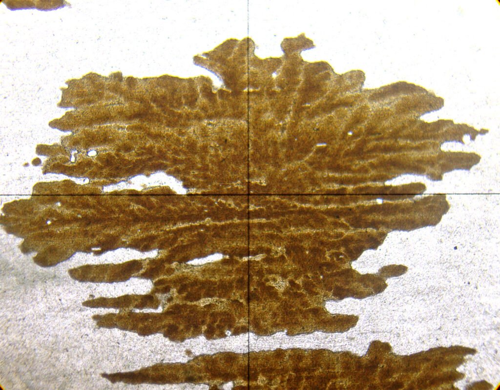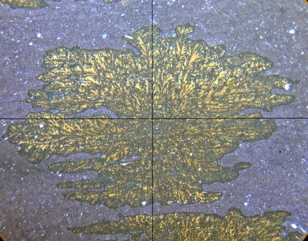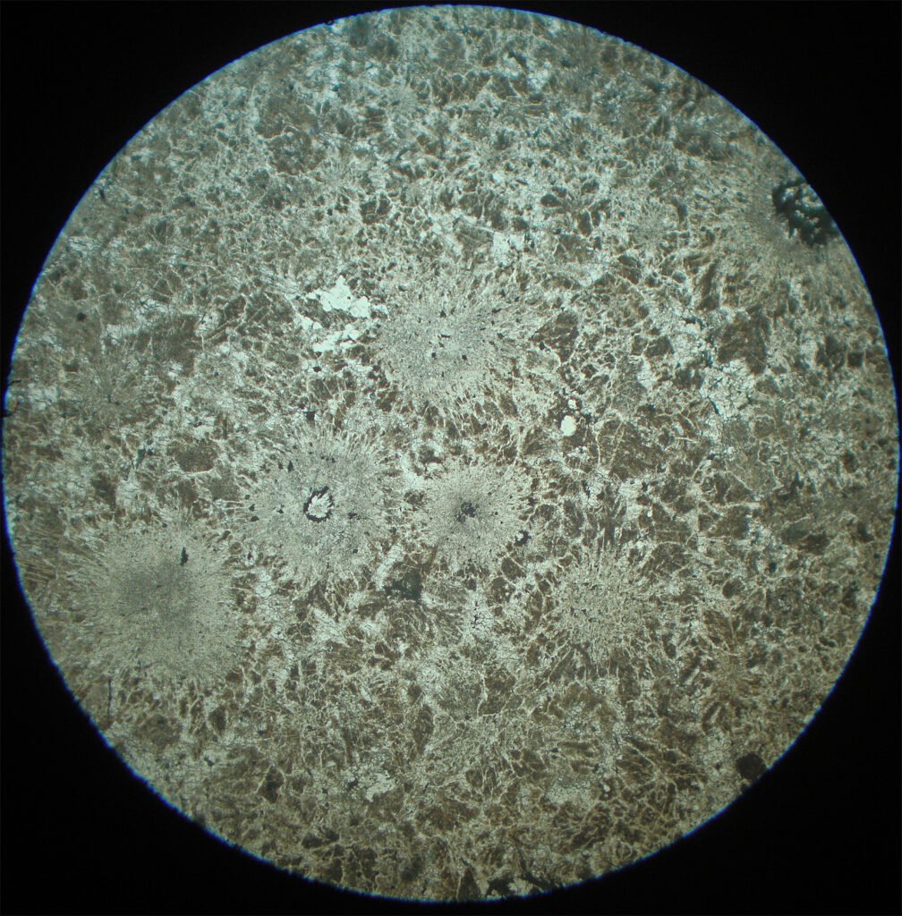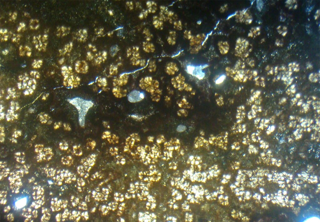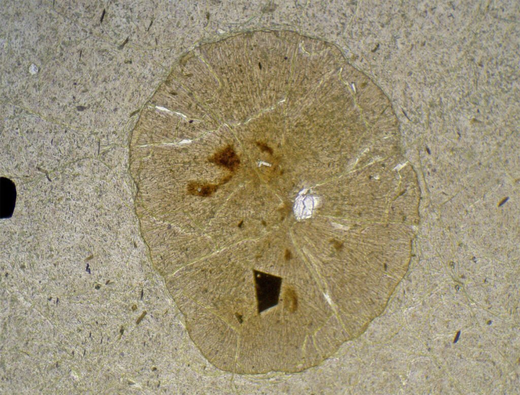 Isotropic.Alterations: can devitrify or alter, all stages are possible. Devitrification propagates from fractures; the glass is replaced by finely crystalline aggregates composed of the minerals that would have formed if the magma had cooled more slowly. There are a number of textures generated by the alteration: acicular crystals (~needles), dendritic structures (~trees), feathery structures (~feathers); spherulites (radial aggregates), etc. Use specialized literature to work on this subject.