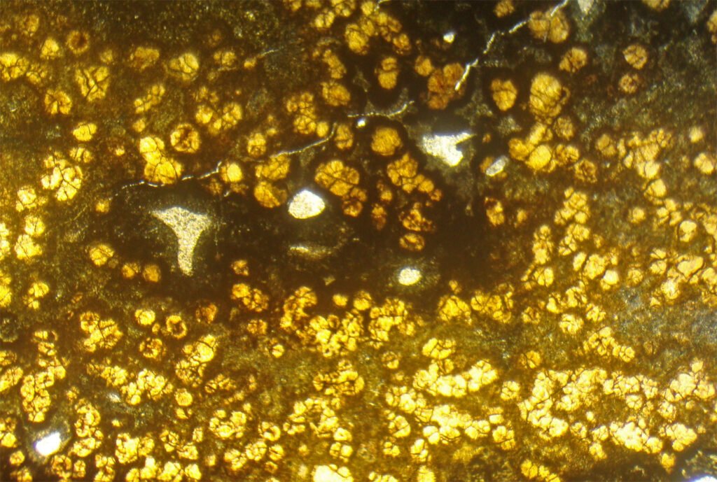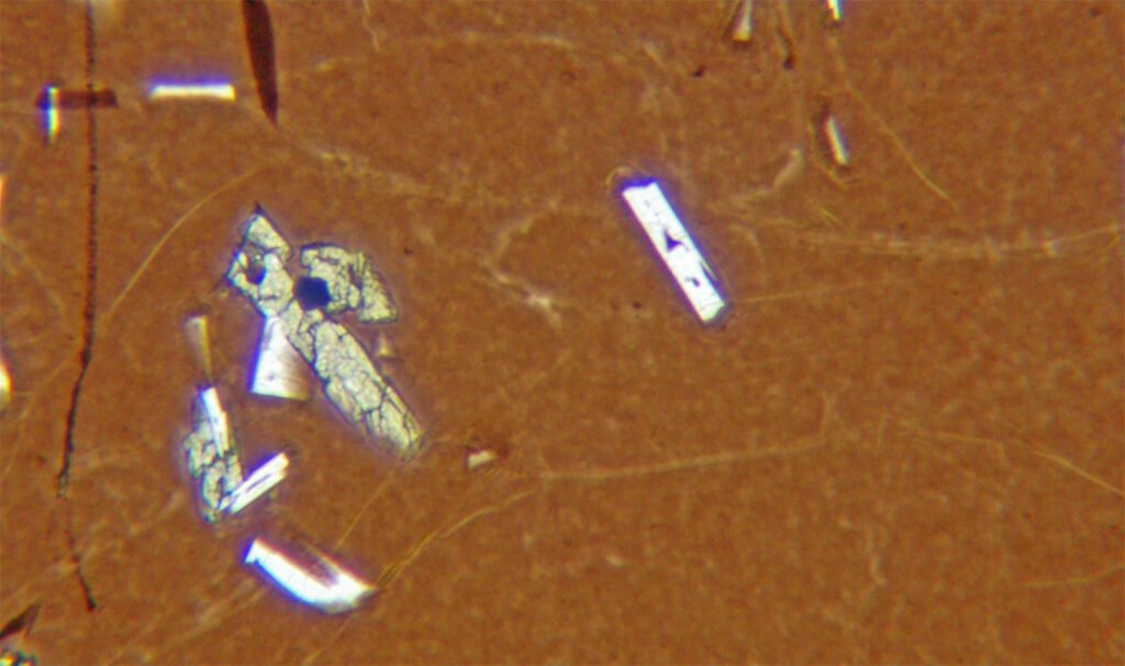 Reflected light microscopy is not the recommended analytical method for the identification of volcanic glass. However, it is important to make a polished thin section or a polished section to identify the opaque minerals that occur associated with volcanic glass, like magnetite, ilmenite, chalcopyrite, pyrite and others.