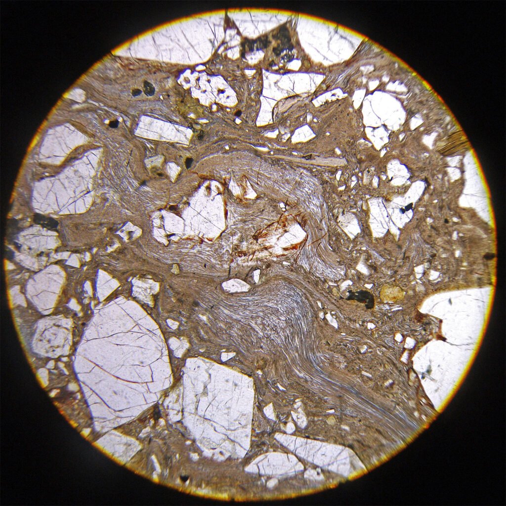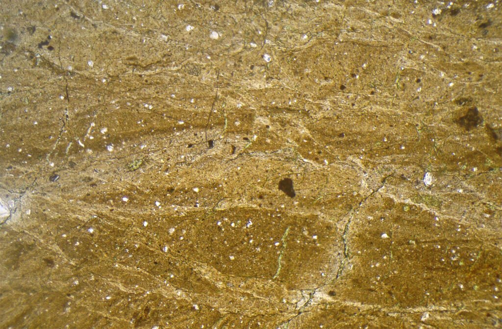 Habits: Without definite shape. It occurs as interstitial material or making up the largest percentage of the rock. It is usually massive, may have flow structures or irregular spherical fractures (perlitic texture), formed by shrinkage during cooling. May have shard textures (typical of ignimbrites) and feathery aggregates due to devitrification.